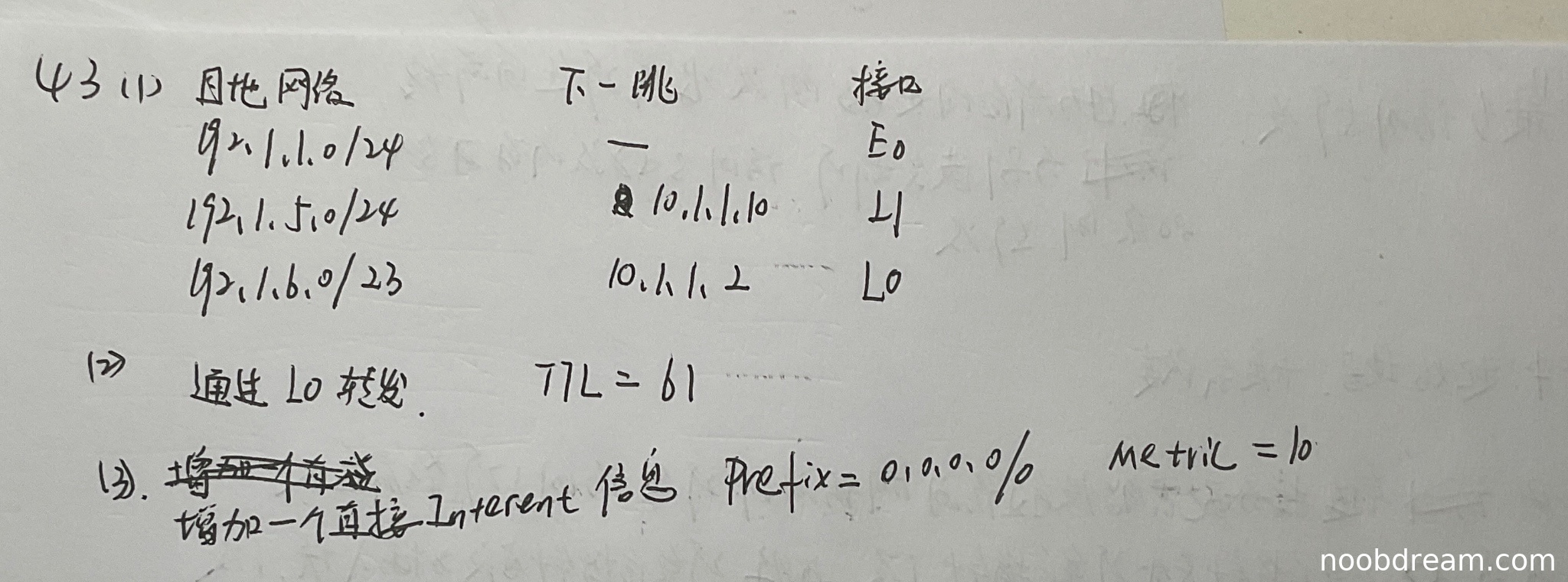 学生答案指出增加Prefix=0.0.0.0/0,Metric=10,与标准答案一致。因此得1分。