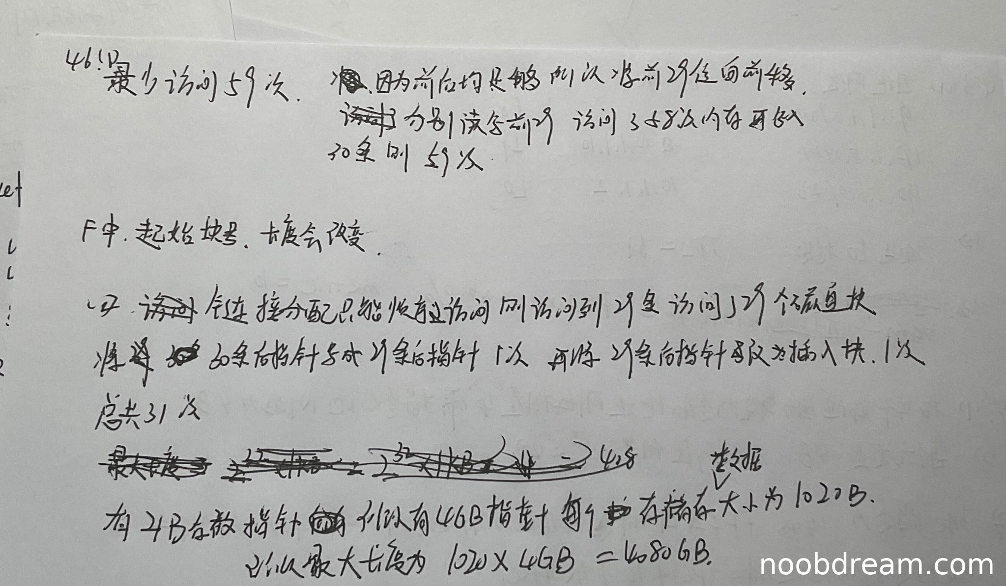 学生答案中,对于访问磁盘块次数的计算正确(31次),并说明了理由(顺序访问29块找到第29条记录,修改指针需要读写操作)。但对于文件最大长度的计算,第一次识别结果正确(4080GB),第二次识别结果错误(46920B)。根据标准答案,正确计算应为4080GB。由于学生作答存在两次识别,且第一次识别正确,第二次可能为识别错误,因此不扣分。该部分得4分。