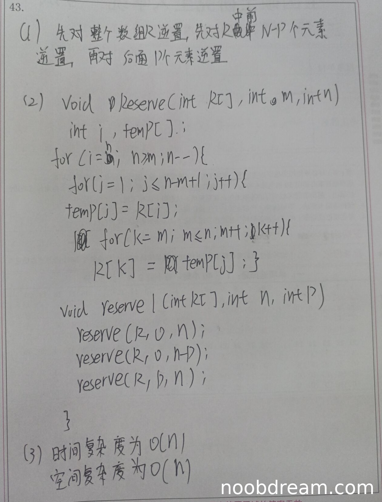 2. reserve函数中,temp数组未指定大小(应为int temp[n-m+1]?),但C语言不支持变长数组声明方式,且代码逻辑混乱(嵌套循环错误,试图用多个循环实现逆置,但实际标准只需一个循环)。