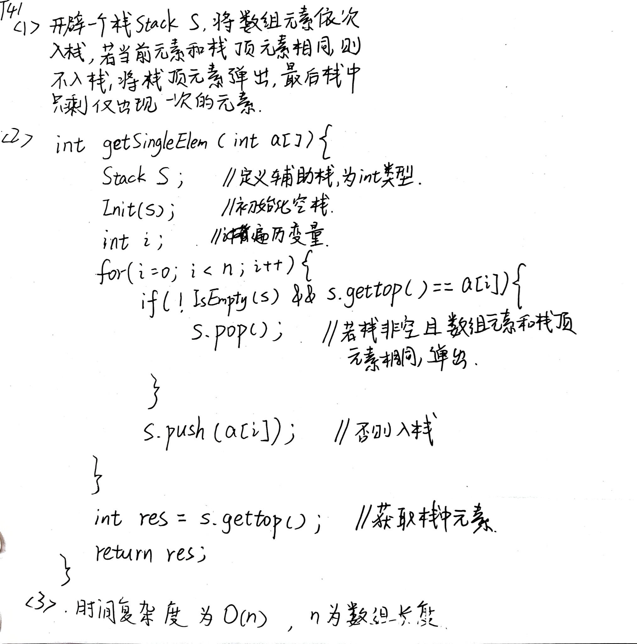 得3分。学生的基本设计思想是使用栈来处理数组元素:依次将元素入栈,若当前元素与栈顶元素相同则弹出栈顶元素(即不保留相同元素),最后栈中剩下的元素即为仅出现一次的元素。该思路正确利用了相同元素相邻的条件,能够高效地找出目标元素,与标准答案的遍历比较方法不同但逻辑正确,因此不扣分。