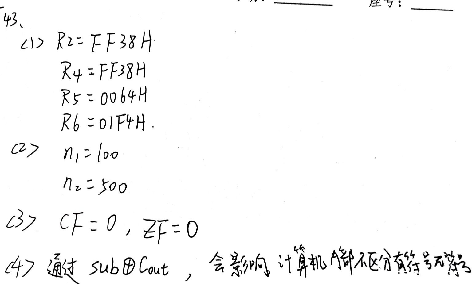 学生答案中R2、R5、R6的十六进制值正确(FF38H、0064H、01F4H),但R4的值应为FFFF FF38H(符号扩展),而学生只写了FF38H(未扩展),因此扣1分。得分:3分。