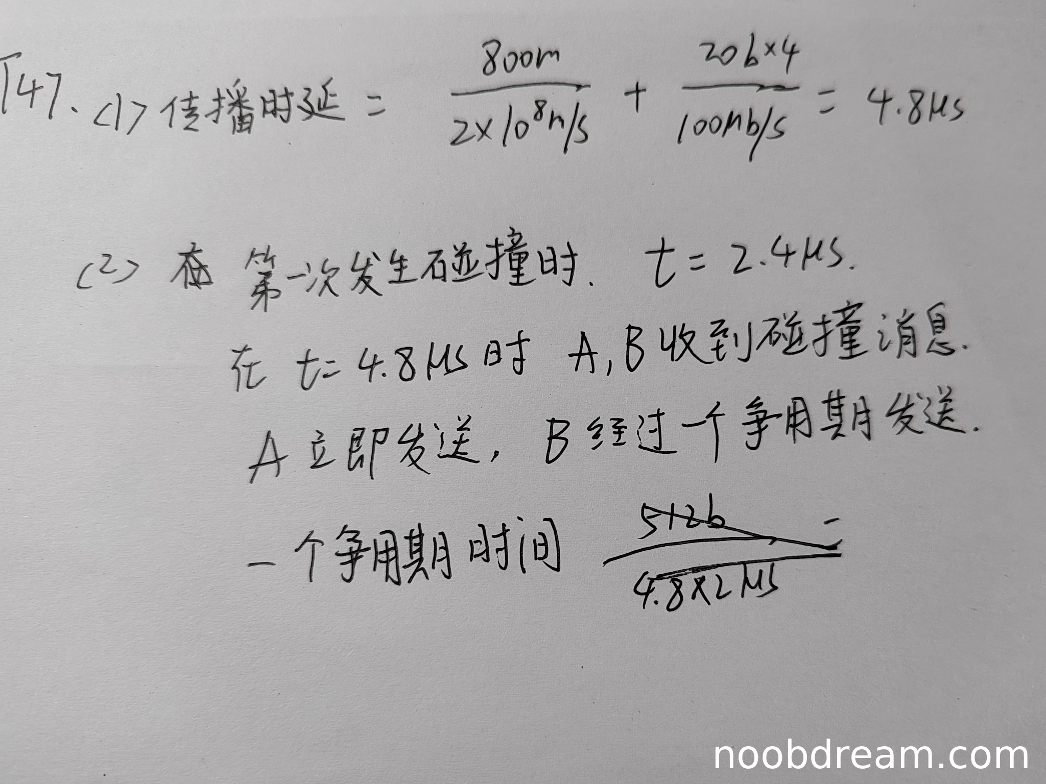 学生答案中分析了碰撞时间点(t=2.4μs和t=4.8μs),但未给出B完全收到A帧的时间(29.4μs)。答案中提到的"t=2.4μs"错误(正确首次碰撞检测时间为4.8μs),且争用期计算部分混乱(如$\frac{512b}{4.8\times2\mu s}$无意义)。整体未正确描述CSMA/CD退避和重传过程,也未计算最终时间,逻辑错误严重。因此得0分。