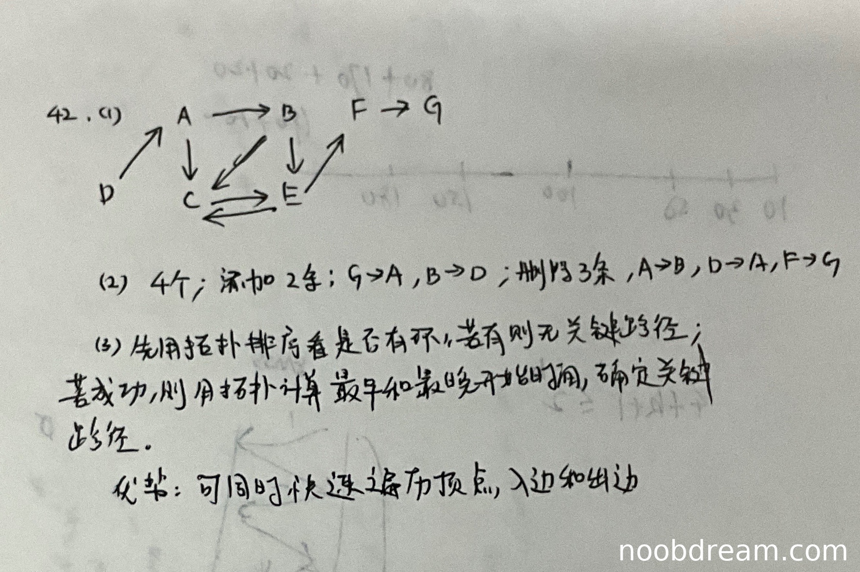 学生正确指出强连通分量数量为4个(与标准答案一致),得1分。但添加边的方案错误(建议添加G→A和B→D,但B→D已存在,且添加两条边并非最少;标准答案为添加1条边),扣1分;删除边的方案错误(建议删除A→B、D→A、F→G共3条,但标准答案为删除2条边,且删除的边需确保无强连通分量),扣1分。因此,本部分得1分(仅强连通分量数量正确)。