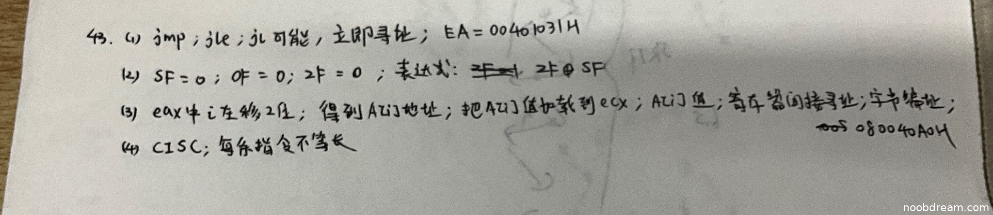 学生答出了可能跳转的指令(jmp、jle、jl),得1分;但寻址方式回答为“立即寻址”错误(应为相对寻址),扣1分;跳转目标地址计算过程未给出(仅写出结果),扣2分。最终得0分。