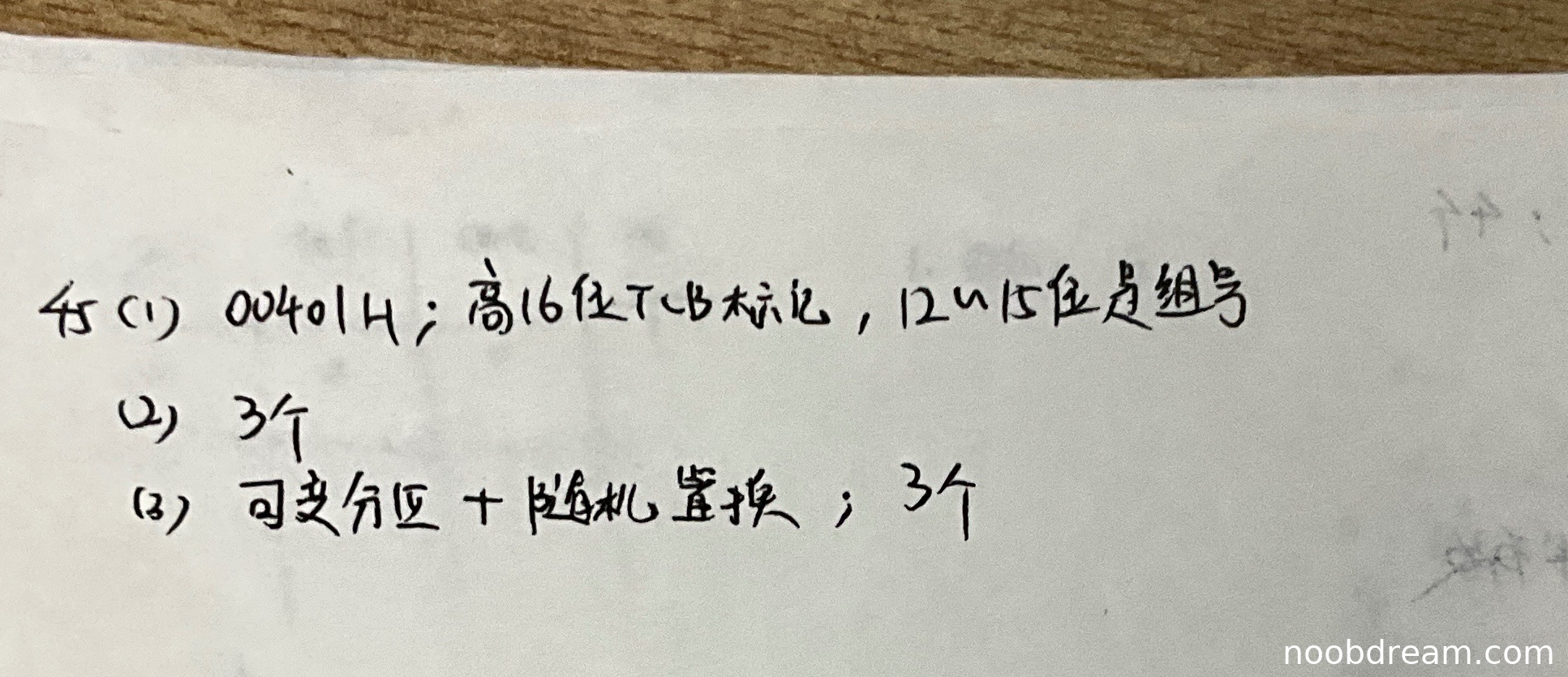 学生第一次识别结果为"004014",但第二次识别结果为"00401H",与标准答案"00401H"一致(H表示十六进制),因此虚页号正确,得1分。关于TLB标记和组号的划分:学生回答"高16位TLB标记,12~15位是组号",但标准答案中组号应为虚页号低4位(即地址位12~15),标记为高16位(地址位16~31)。学生回答正确,得1分。本小题共得2分。