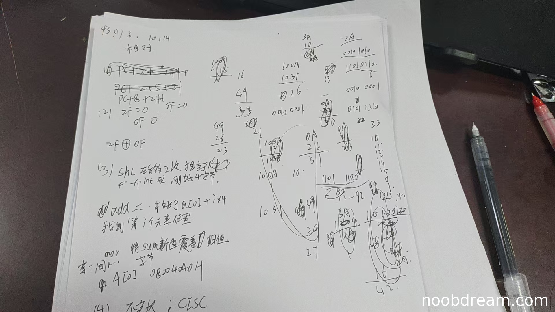 学生答案指出shl左移2次相当于×4(1分)、add计算A[0]+i×4(1分)、mov更新sum值(此处错误,应为读取A[i]到ecx,扣1分);ecx内容未明确(扣1分);寻址方式未回答(扣1分);编址方式未直接回答但通过偏移计算隐含按字节编址(1分);A[0]地址给出08040A04h(与标准答案0804A010h不符,扣1分)。得分为3分。