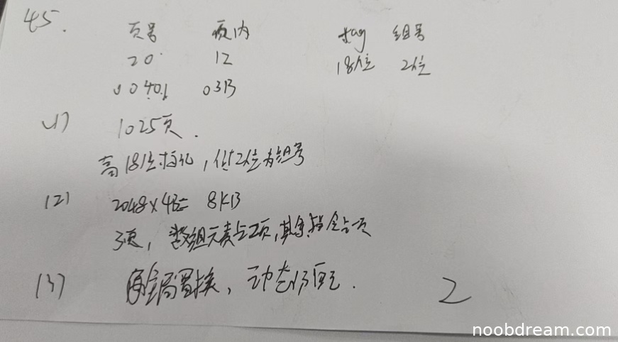 学生答案中给出了虚拟页号为00401H(十六进制),但未明确写出划分方式。第一次识别提到"高18位存储,低2位存组号",第二次识别提到"高18/位插北,低2/位为组号",但根据标准答案,TLB组号应为4位(因为16组需要log2(16)=4位),标记应为16位(20位虚页号减去4位组号)。学生答案中组号位数错误(2位而非4位),标记位数错误(18位而非16位),但虚拟页号00401H正确。由于核心逻辑错误(组号和标记位数计算错误),扣1分。得1分。