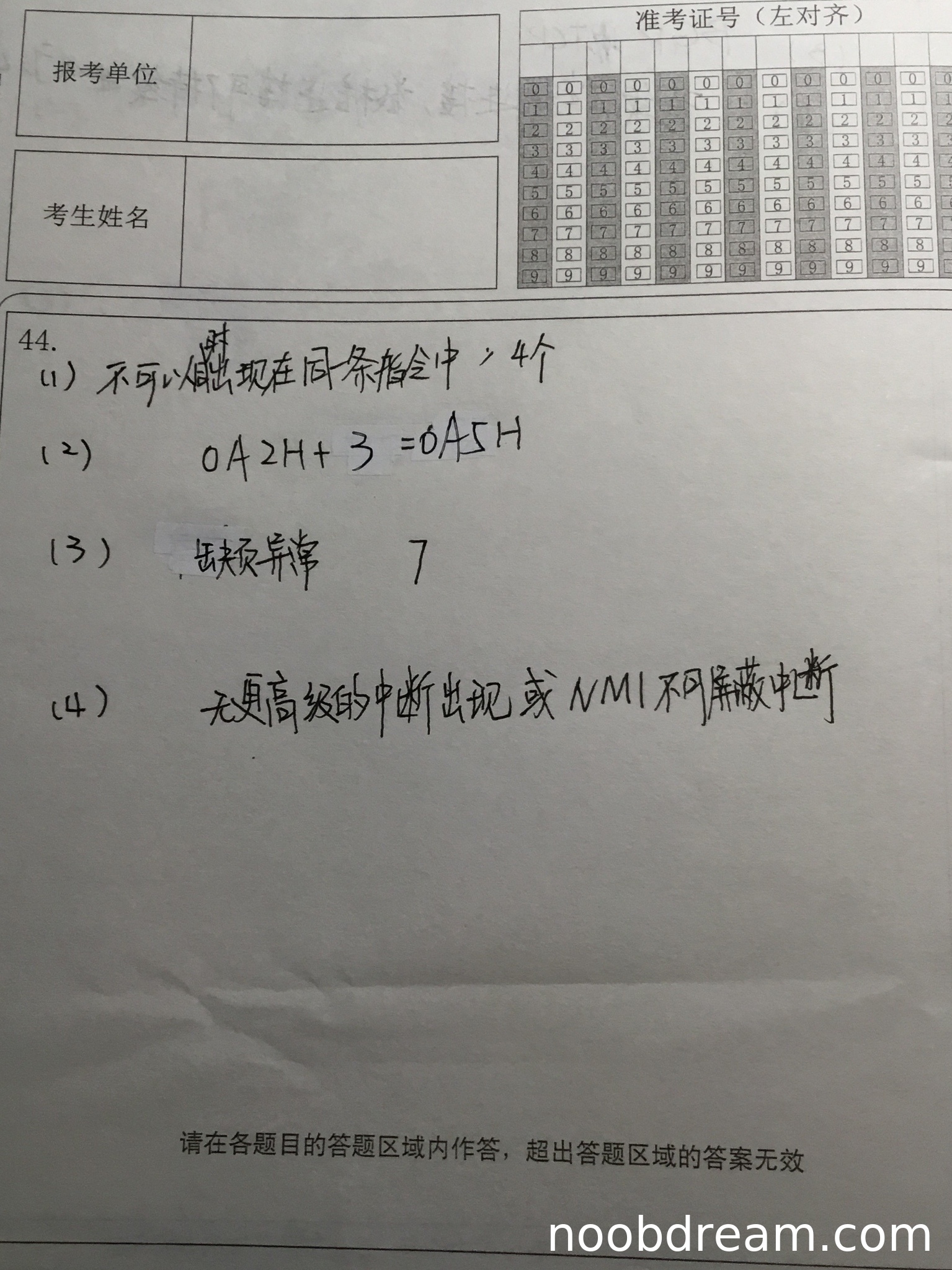 学生回答“无更高级的中断出现或NMI不可屏蔽中断”不完整(缺少开中断状态、中断未屏蔽、当前指令执行完成等条件),扣2分。最终得0分。