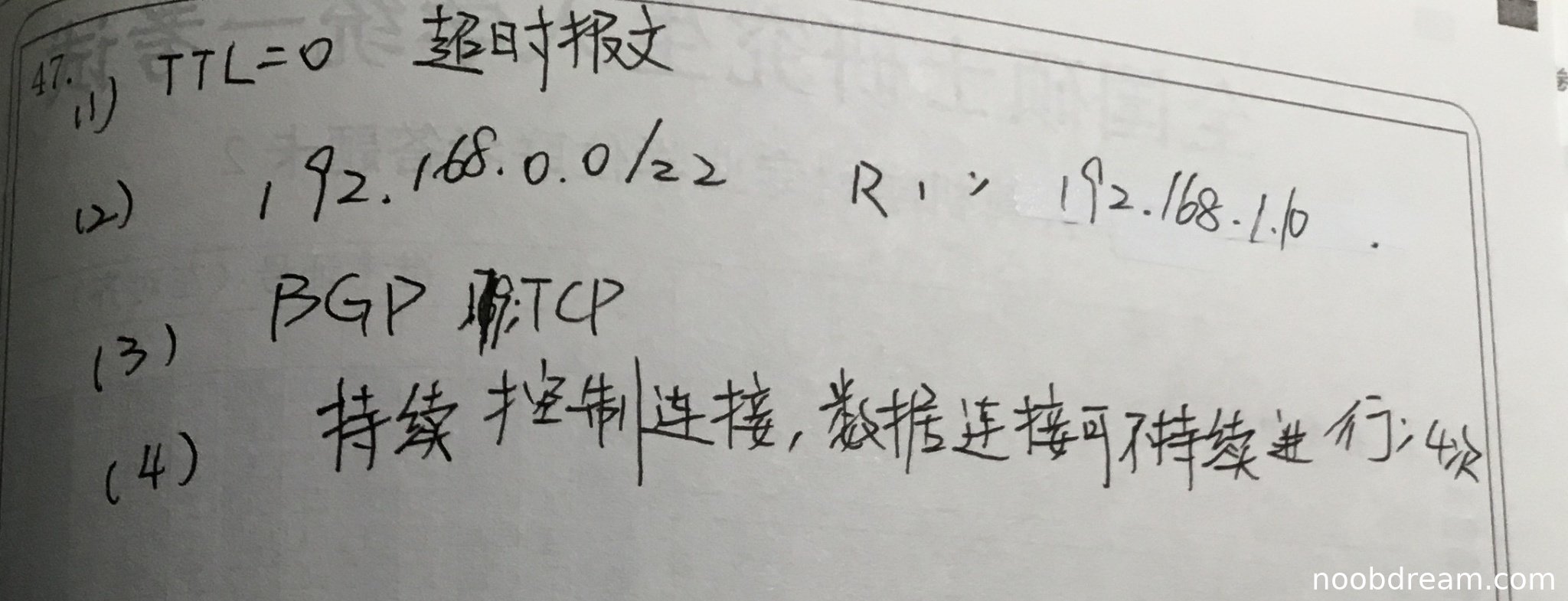学生答案"BGP 靠 TCP"或"BGP TCP"正确指出了协议名称(BGP)和基于的传输协议(TCP),但未回答端口号179。根据评分标准,回答不完全,扣1分。得2分。