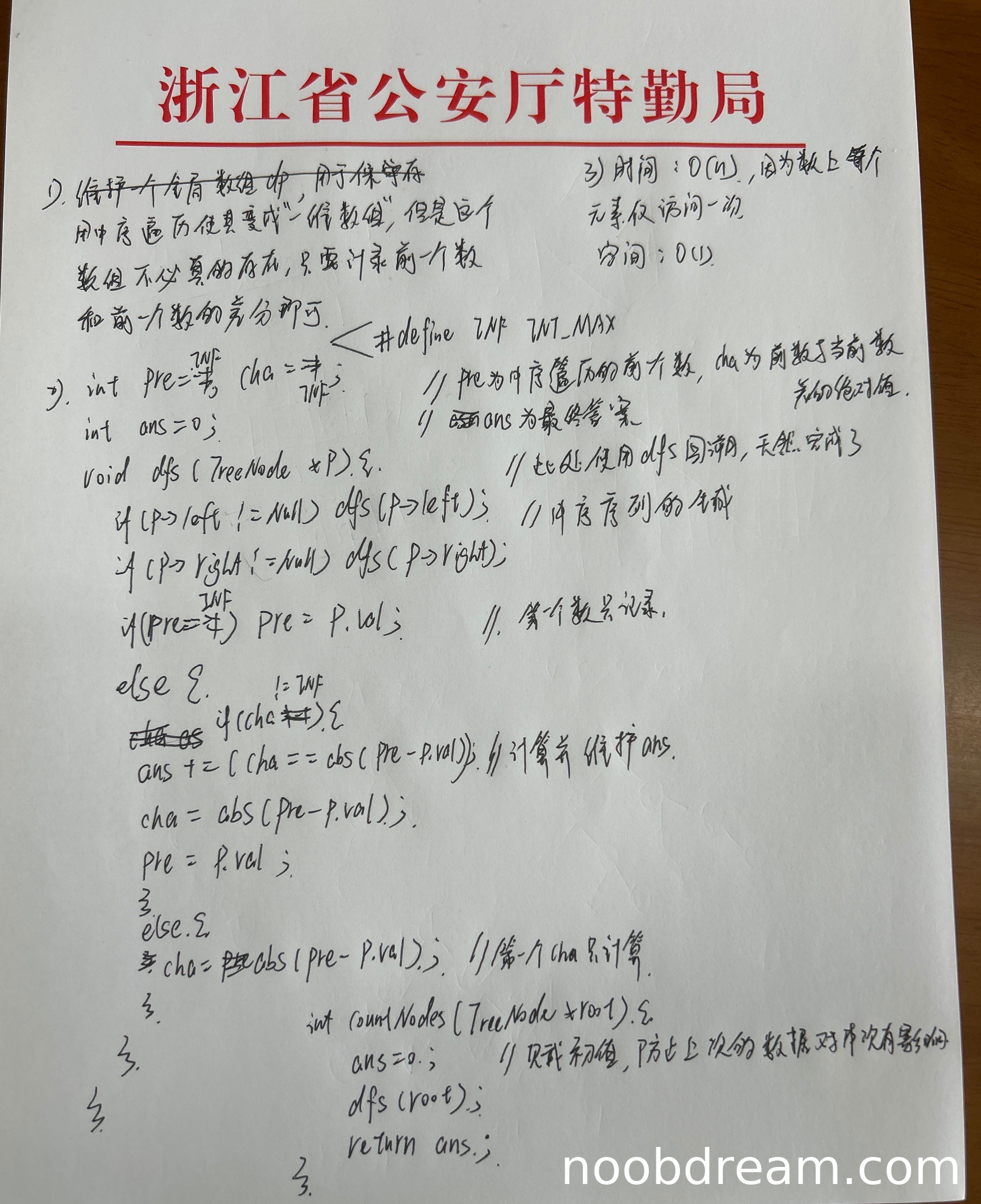 学生答案中描述的设计思想不清晰,且与题目要求不符。题目要求统计满足特定条件的结点数(即同时存在左右子树,且左右子树与当前结点的最小距离相等),但学生答案中提到了“中序遍历”和“记录前一个数和差分值”,这实际上是试图计算相邻结点的差值,而非题目要求的左右子树的最小距离。设计思想错误,未能正确理解题目要求。因此,得0分。