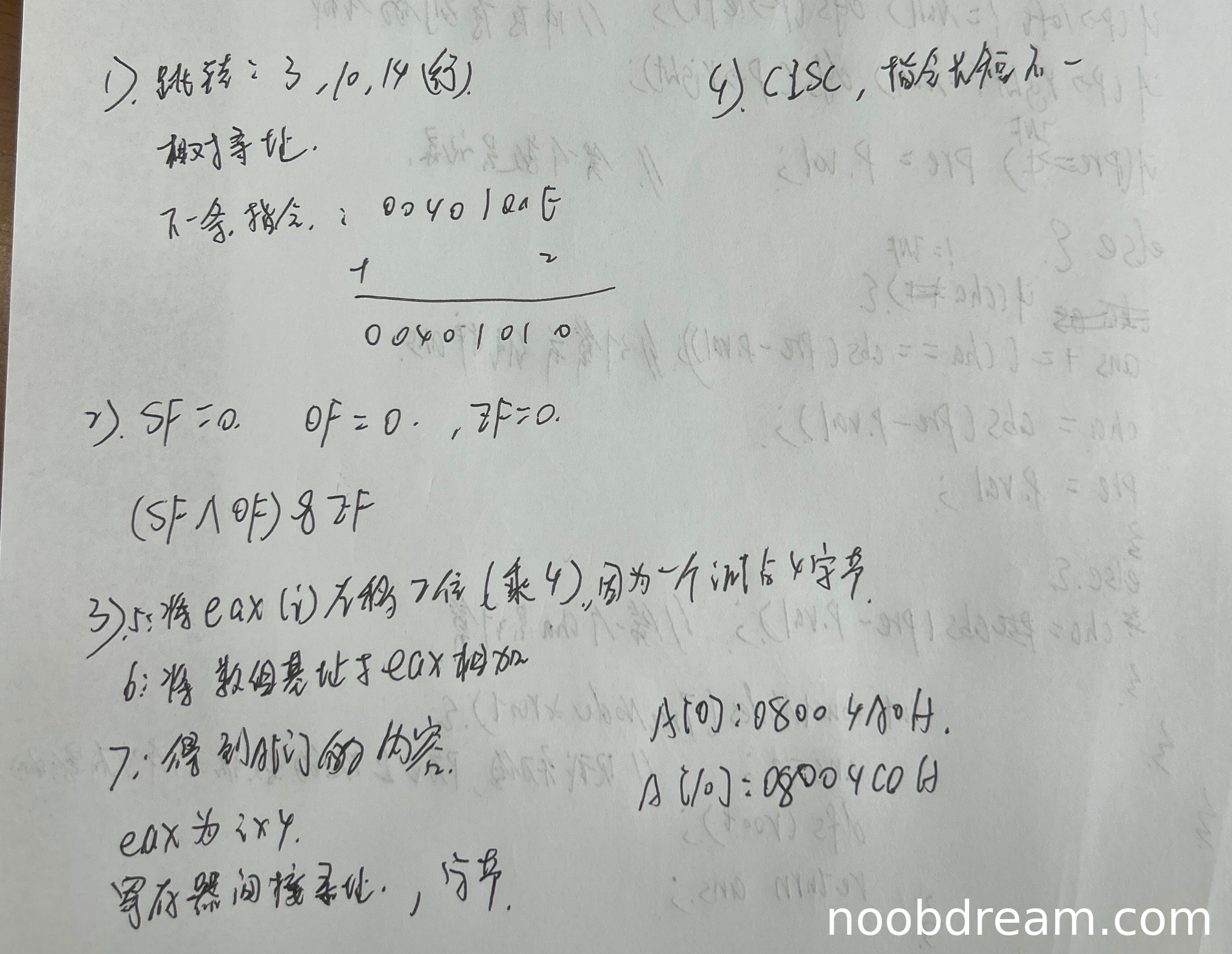 学生正确识别出跳转指令为3、10、14(但“约”或“的”可能是识别误差,不影响判断),并指出相对寻址方式(1分)。但目标地址计算过程有误:学生给出“下一条指令: 00401a05”或“00401005”,与标准答案(00401010H)不符,且未提供偏移量计算(标准要求偏移量21H和加法过程)。计算过程部分错误,扣1分。得分:2分(跳转指令和寻址方式正确1分,计算过程部分正确1分?但计算过程完全错误,应扣2分?仔细分析:学生未给出正确PC值和偏移量计算,仅列出错误地址,故计算过程得0分。因此本部分得分:1分(仅跳转指令和寻址方式正确)。