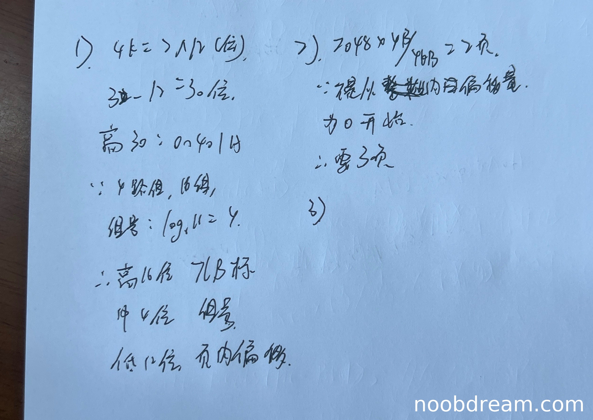 学生第一次识别结果中,虚拟页号计算为0n401H(应为00401H),但给出了正确的页内偏移(12位)和组号位数(4位),并正确划分了TLB标记(高16位)和组号(中4位)。第二次识别结果中,虚拟页号计算错误(0x4010),但组号划分正确。由于核心逻辑正确(页内偏移12位、组号4位、标记16位),且虚拟页号错误可能为识别误写(如"0n401H"可能为"00401H"的误识别),因此不扣分。得2分。