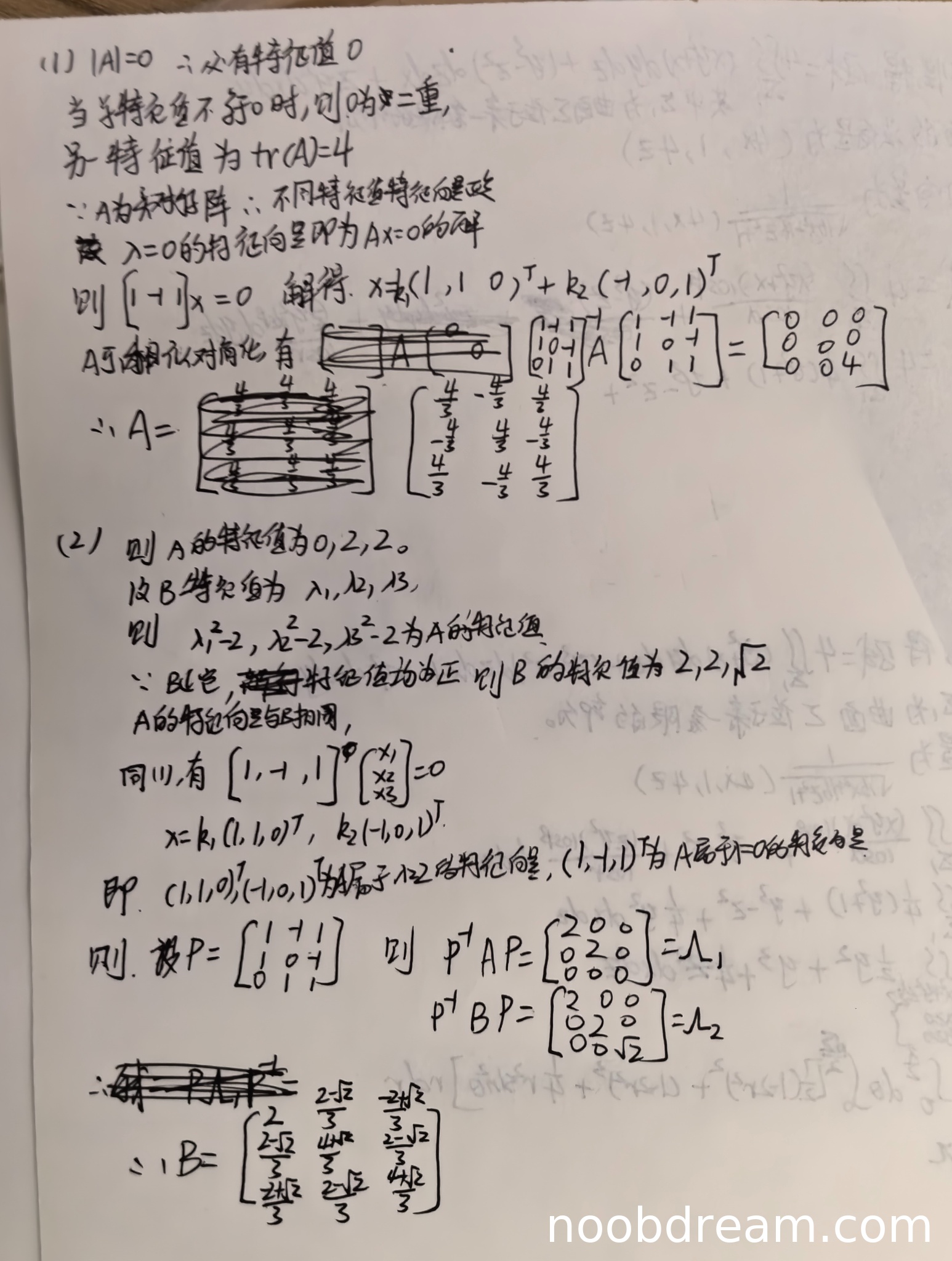学生正确判断单特征值等于0时A的特征值为0,2,2,并指出B的特征值应为2,2,√2(通过λ^2-2=A的特征值推导)。给出了特征向量的正确形式,并试图通过相似对角化求B。但相似变换矩阵P的选择错误(如第二次识别中P矩阵的列向量不是正交基,且未单位化),导致后续B的计算缺失。核心思路正确,但未完成正定矩阵B的具体计算,扣3分。得3分。