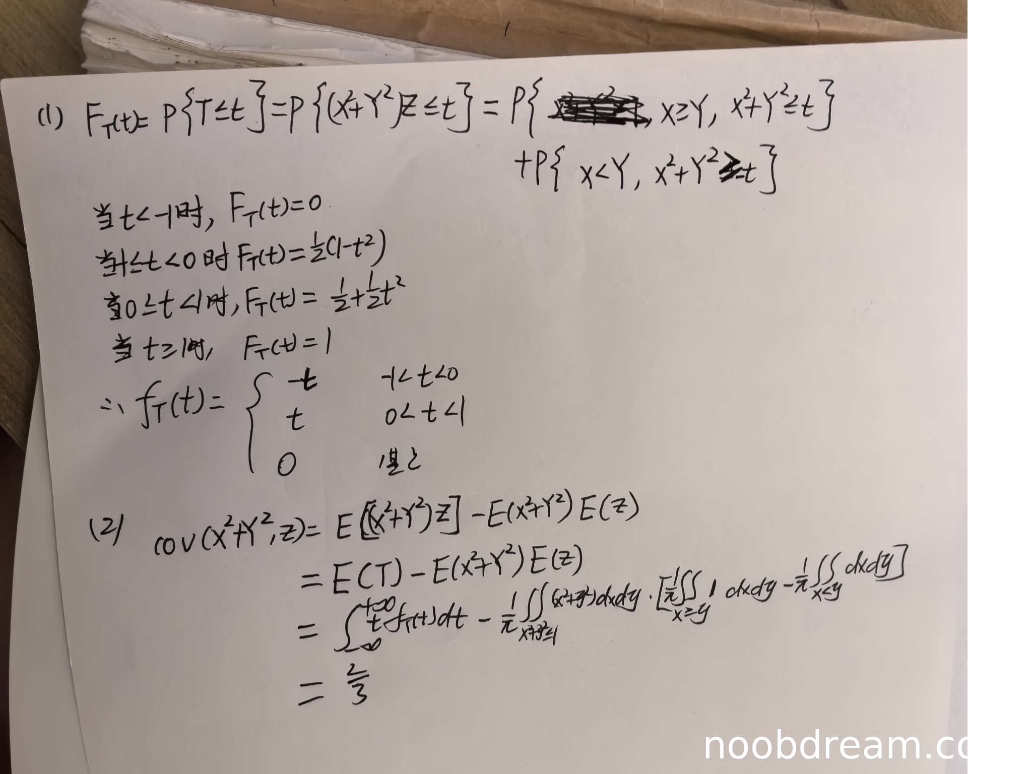 学生答案中,对于T的分布函数和概率密度函数的求解存在多处错误。首先,在定义F_T(t)时,第一次识别中写成了P{(X^2+Y^2)Z≤t} = P{x≥Y, x^2+Y^2≤t} + P{x 得分:0分 (Ⅱ)得分及理由(满分6分) 学生答案中,协方差公式正确,但计算过程错误。首先,E[(X^2+Y^2)Z]应为E(T),但学生第一次识别中写成了E(ZT)(冗余),第二次识别中误写为E(T)但计算错误。标准答案中E(T)=0,而学生通过积分计算得到2/3或1/3,错误。其次,E(X^2+Y^2)的计算,学生试图用二重积分但表达式错误(如第二次识别中写成了E(X+Y^2)),且积分区域和概率密度使用错误(均匀分布密度应为1/π,但学生写成了1/π∬...,但表达式混乱)。E(Z)的计算也错误(标准答案为0,学生表达式错误)。最终协方差结果错误(2/3或1/3,标准答案为0)。这些是逻辑错误,扣分。但识别中"X+Y^2"可能为"X^2+Y^2"误写,不扣误写分。本题满分6分,扣6分。 得分:0分 题目总分:0+0=0分