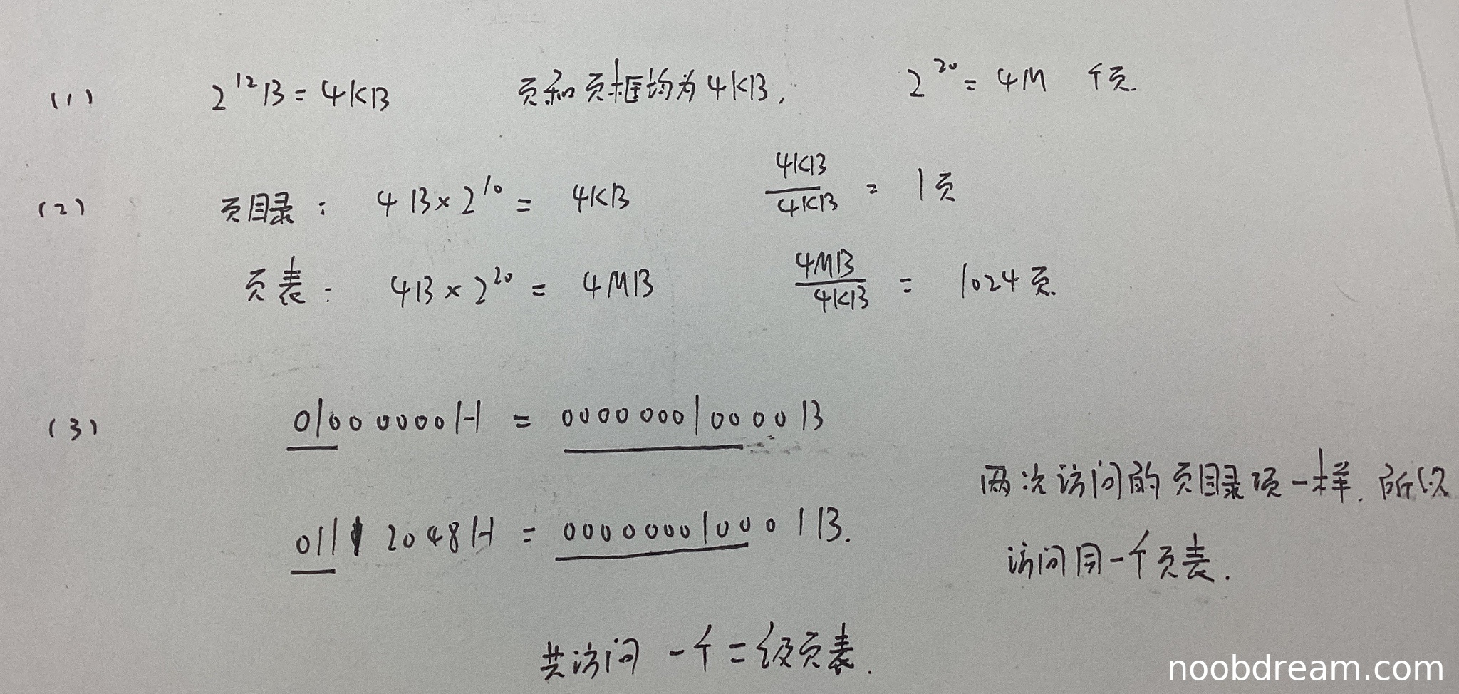 学生正确计算页目录占1页(4B×2^10=4KB,4KB/4KB=1),得1分;正确计算页表占1024页(4B×2^20=4MB,4MB/4KB=1024),得1分。但标准答案为1025页(页目录1页+页表1024页),学生未求和,但问题要求“页目录和页表共占多少页”,学生分别计算但未给出总和,属于逻辑错误,扣1分。因此本小题得1分。
