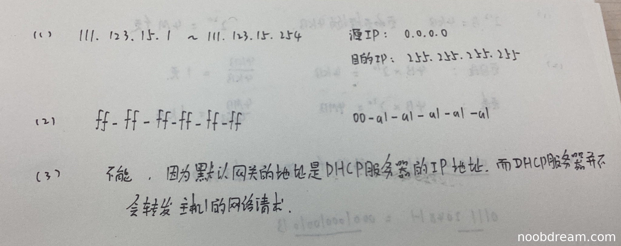 学生答案中DHCP分配IP地址范围写为111.123.15.1~111.123.15.254,但标准答案为111.123.15.5~111.123.15.254。因为111.123.15.1是路由器内网接口地址,111.123.15.2是DHCP服务器地址,111.123.15.3是WWW服务器地址,111.123.15.4是主机1地址,这些均为静态地址,不应在DHCP动态分配范围内。但学生答案中源IP(0.0.0.0)和目的IP(255.255.255.255)完全正确。由于IP范围错误,扣1分。得2分。