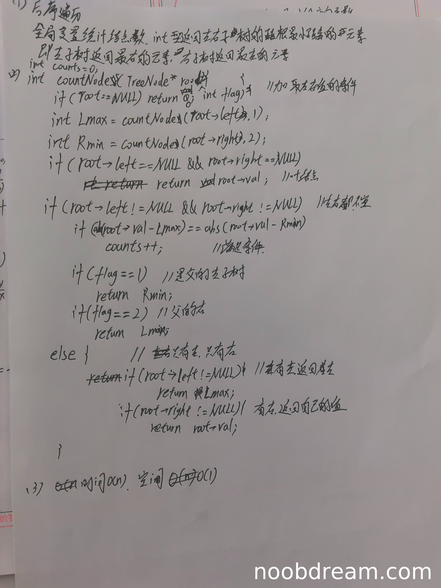 1. 使用递归后序遍历,尝试返回子树的极值(左子树返回最大值,右子树返回最小值),但代码逻辑存在多处错误: