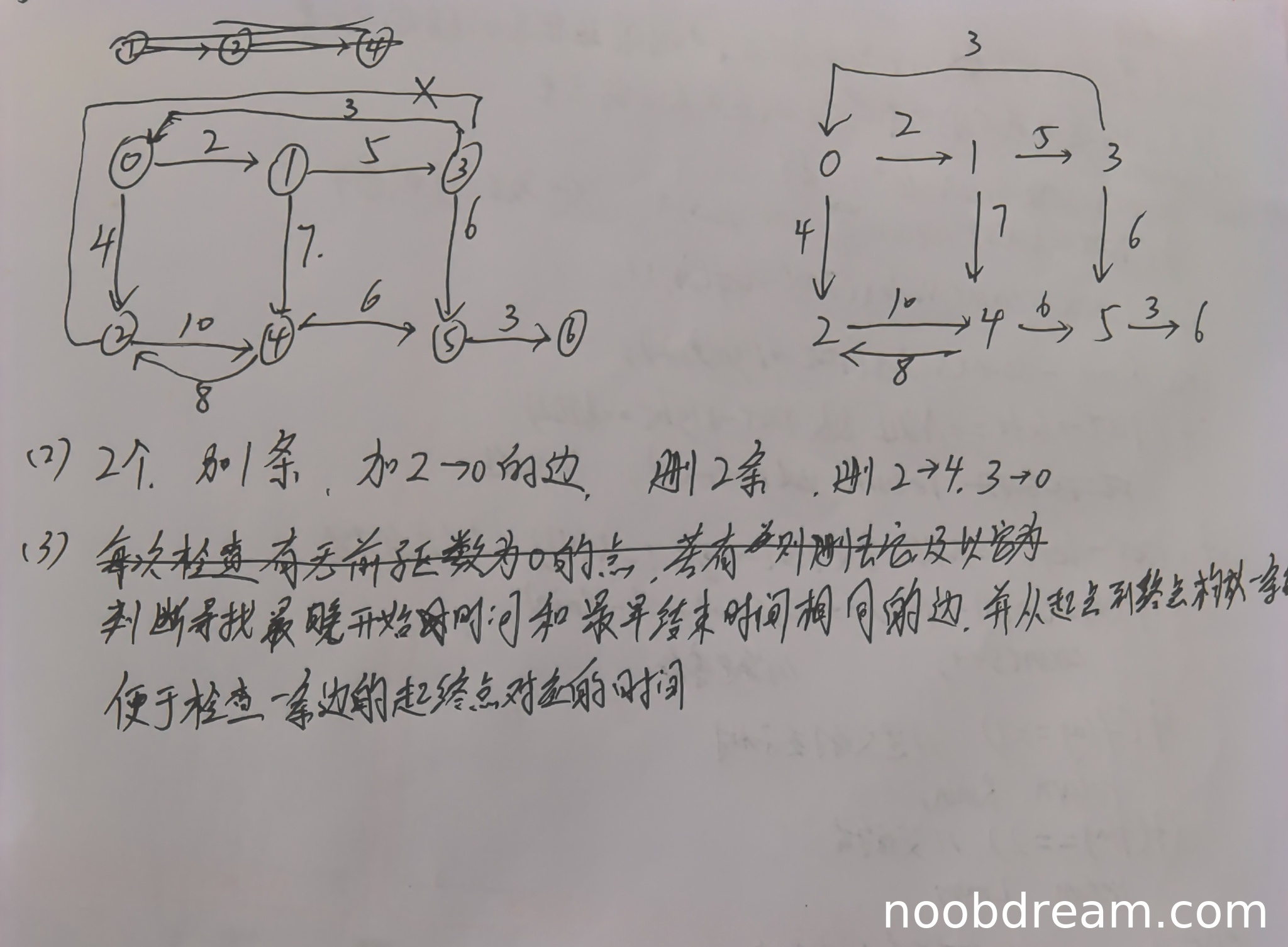 学生回答拓扑排序判断部分“每次检查有无前驱数为0的点,若有则删去它及以它为起点的边”(描述基本正确,但未说明关键路径存在需满足DAG和AOE网条件),扣1分;优势部分回答“便于检查一条边的起终点对应的时间”(未明确十字链表可直接访问入边,优于邻接表需构建逆邻接表),扣1分。本问总得分:1分(思路部分正确但遗漏关键点)。