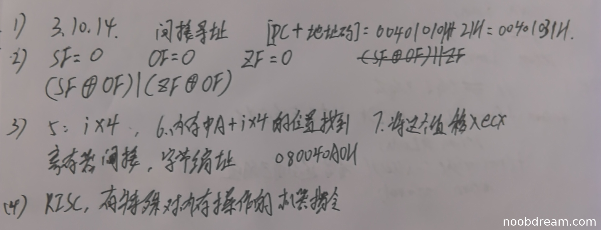 学生正确分析了指令5(i×4)和指令7(寄存器间接寻址),各得1分;编址方式回答“字节编址”正确,得1分;但指令6功能描述不准确(“内存中A+i×4的位置找到”未明确计算地址),扣1分;ecx内容未明确回答(“将这个值移入ecx”不准确),扣1分;A[10]地址计算错误(080040A0H),扣1分。本小题得3分。