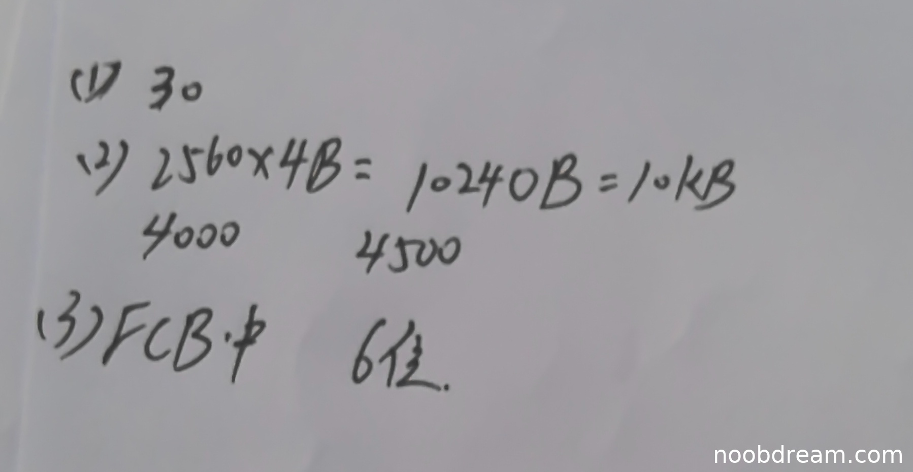 学生答案给出30,但标准答案要求分别计算文件A的三个簇(30000、32000、42500)在位图中的状态位所在簇号,分别为30、30、31。学生仅回答30,未完整覆盖三个簇的计算,且未说明计算过程。因此,只能得到部分分数。根据标准答案,每个簇的计算各占1分,学生仅正确计算了前两个簇(30000和32000)的状态位所在簇号(均为30),但未计算42500簇(应为31)。故扣1分,得2分。