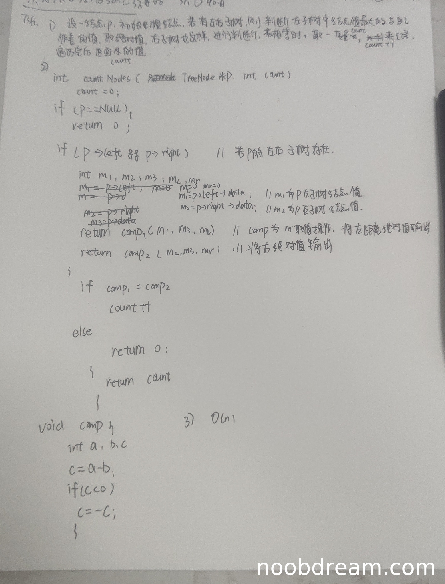 学生答案中描述了基本思路:对每个结点判断是否存在左右子树,若存在则计算左子树最大值与当前结点的差的绝对值(即左子树最小距离),以及右子树最小值与当前结点的差的绝对值(即右子树最小距离),并比较是否相等。该思路利用了二叉搜索树的性质(左子树最大值即最右结点,右子树最小值即最左结点),与标准答案中的“次优解”设计思想一致。但描述中未明确说明如何获取左子树最大值和右子树最小值(例如通过循环查找最右/最左结点),且部分细节(如遍历方式)未提及。因此扣1分,得2分。