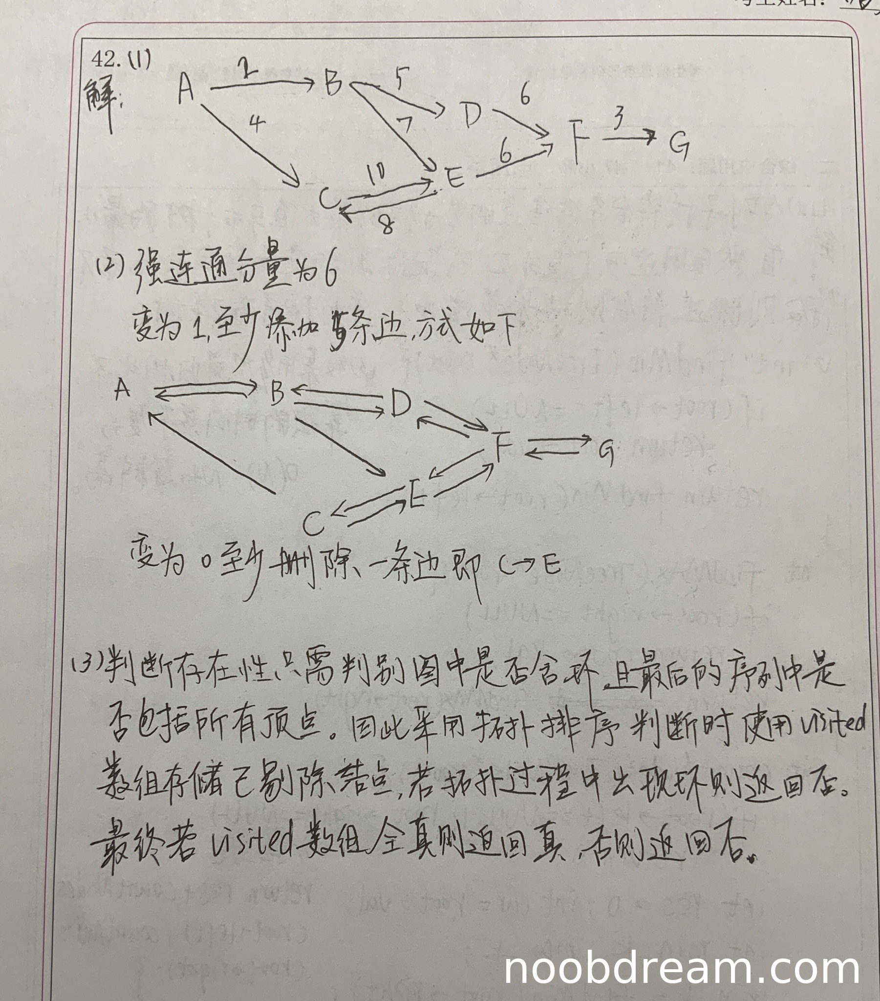 学生答案错误:① 强连通分量数量应为4({A,B,D}、{C,E}、{F}、{G}),但学生回答为6,逻辑错误;② 添加边方案错误(需添加至少1条边,但学生说5条);③ 删除边方案部分正确(删除 C→E 边可破坏 {C,E} 分量,但还需删除 D→A 边以破坏 {A,B,D} 分量,学生仅删除1条边,但实际需删除2条)。因此,强连通分量数量回答错误扣1分,添加边方案错误扣0.5分,删除边方案部分正确得0.5分。本小题得0分。