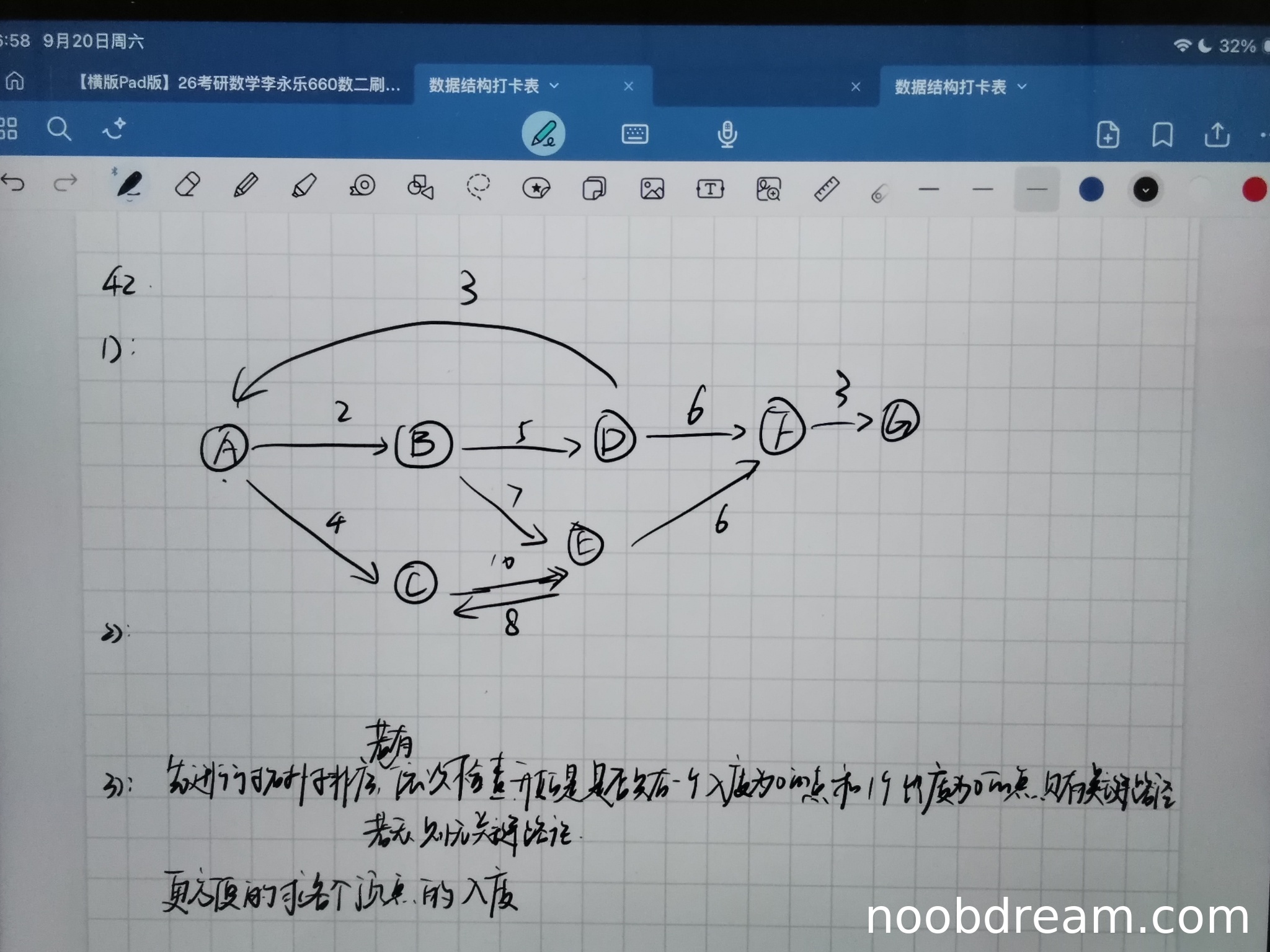 学生回答判断关键路径的思路:先进行拓扑排序,检查是否存在一个入度为0的点和一个出度为0的点,如有则有关键路径,否则无。标准答案要求:①通过拓扑排序判断是否为DAG(拓扑序列长度等于顶点数);②验证唯一源点(入度0仅1个)和唯一汇点(出度0仅1个),并检查源点可达所有顶点、汇点被所有顶点可达,权值为正。学生答案仅部分正确(提到拓扑排序和检查入度0/出度0点),但未说明需验证DAG、可达性和权值条件,且未说明十字链表的优势(直接访问入边,便于逆拓扑计算)。扣2分(思路不完整扣1.5分,缺失优势说明扣0.5分)。