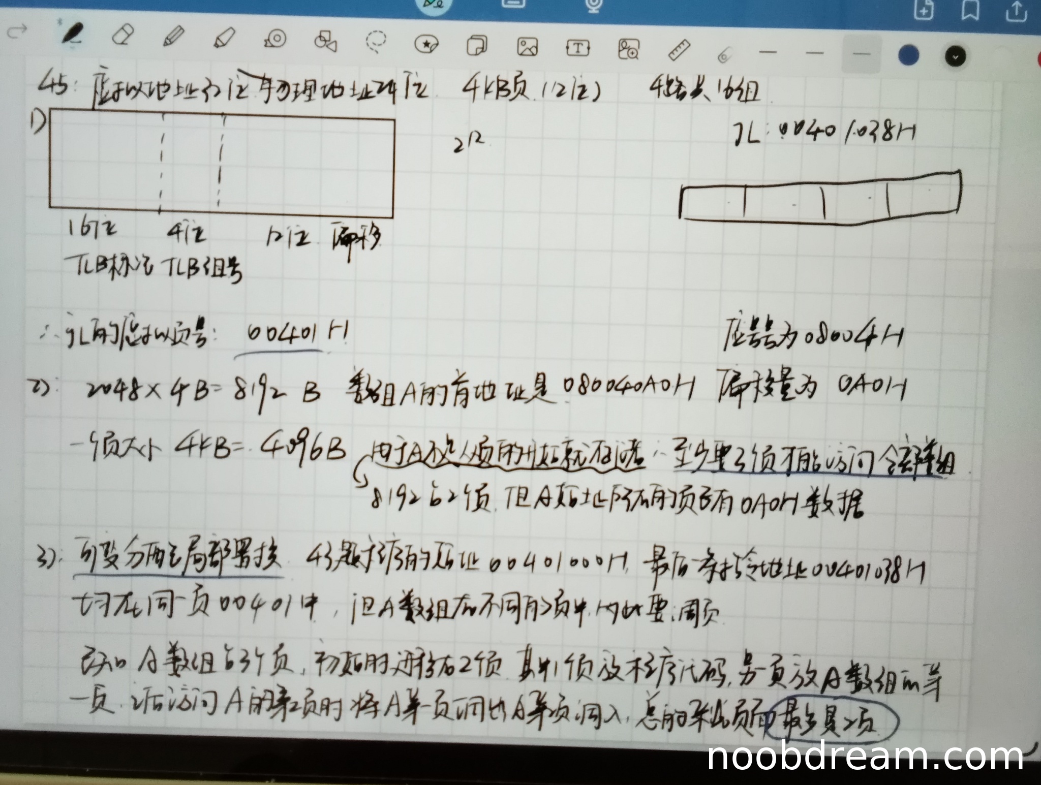 学生正确计算出数组A总大小为8192B(2048×4B),并指出需要3个页面(因为8192B > 4096B×2),与标准答案一致(1分)。但学生错误地给出了数组首地址为080040A0H(应为0804A010H),且偏移量0A0H的表述不准确,但根据上下文判断可能是识别错误,且核心逻辑(占3页)正确,因此不扣分。学生还提到指令部分在同一页(00401H),占1页,与标准答案一致(1分)。最后,学生未明确回答“至少需要访问4个虚拟页面”(指令1页+数组3页),但第二次识别结果中提到了“A数组占3页”和“程序代码”页,隐含了4页的概念,因此给1分。最终得3分。
