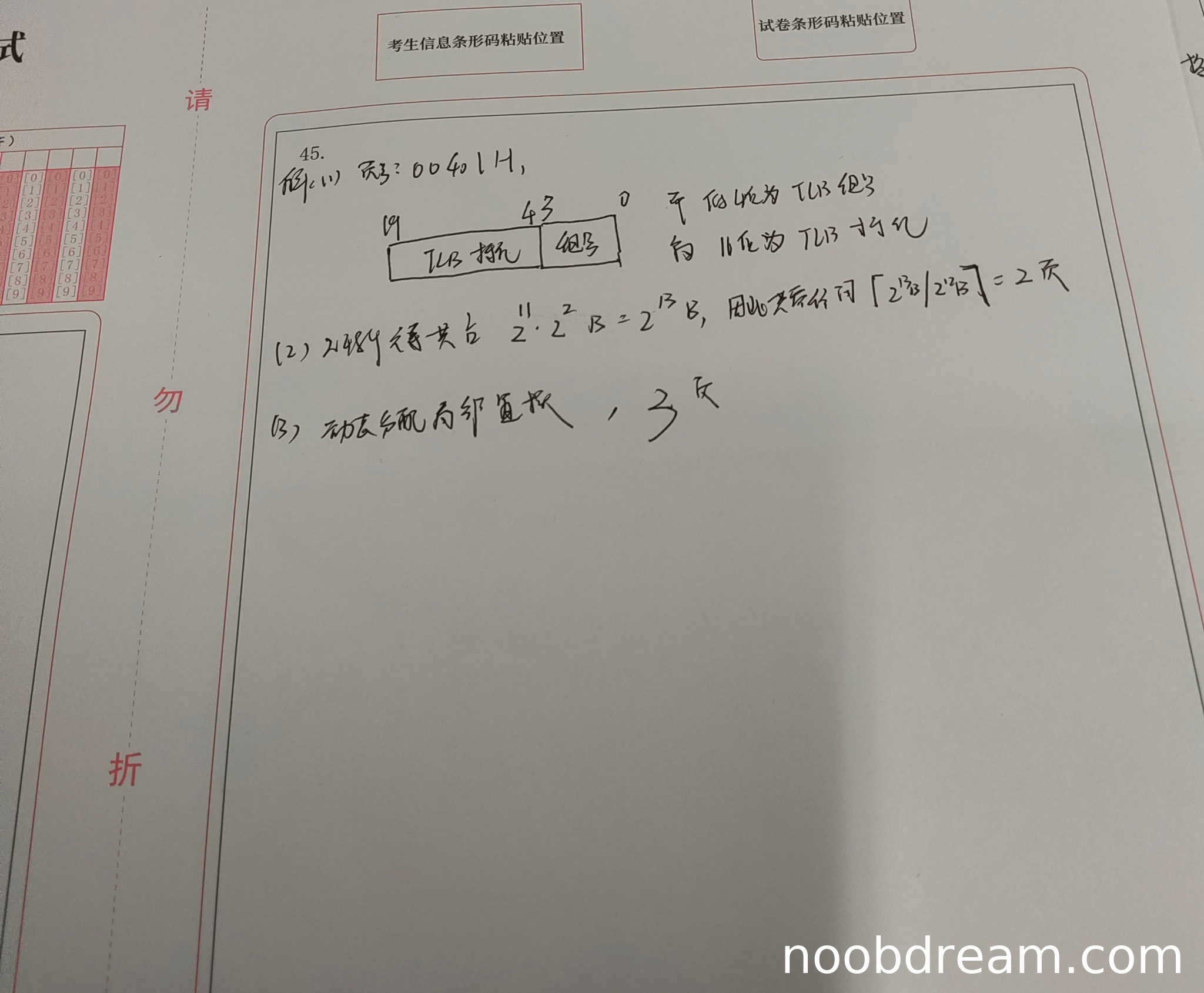 学生第一次识别结果中给出了页号004014H(应为00401H,但识别错误可能为误写),并提到TLB标记和组号划分,但描述混乱无法理解。第二次识别结果给出了正确的页号00401H,但后续描述仍混乱。由于页号正确(可能误写多了一个4),且题目要求虚页号划分,但学生未明确给出组号和标记的位数,因此扣1分。得1分。