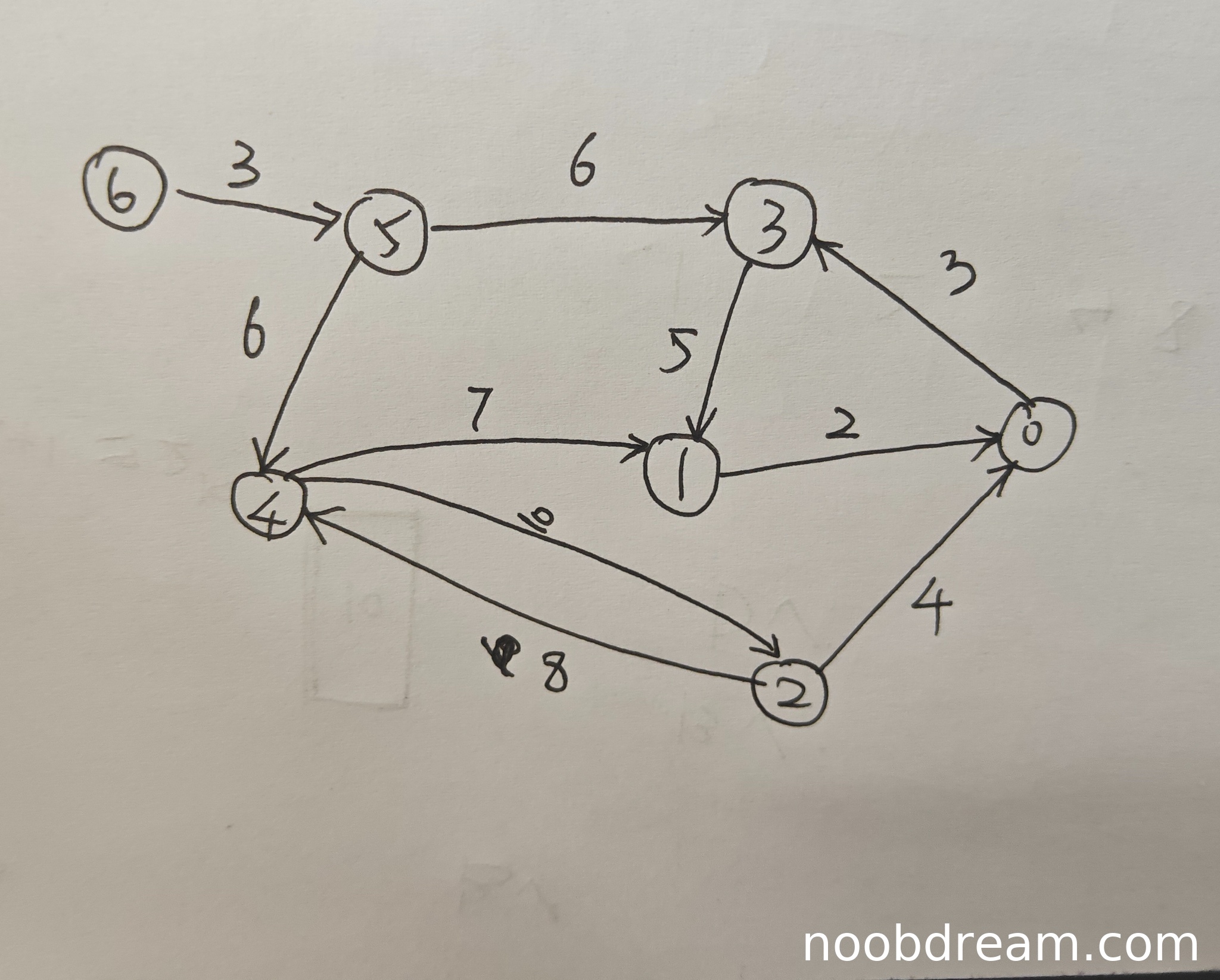 学生根据十字链表存储结构画出了带权有向图,但图中节点编号与题目要求(顶点编号0~6对应A~G)不完全一致,且边权重存在错误(如识别中出现了权重9,但原图无此边)。但整体结构基本正确,反映了强连通分量和边的关系。扣1分。