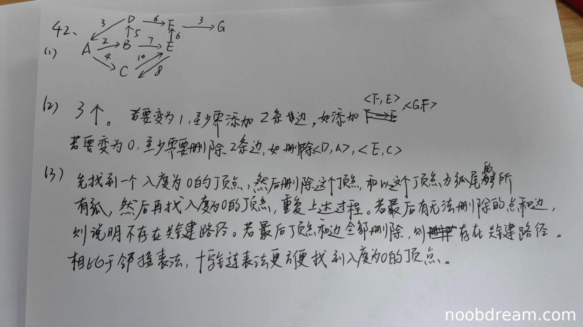 学生描述了拓扑排序的过程(删除入度为0的顶点及弧),但未说明关键路径存在的条件(如DAG、唯一源点和汇点、权值为正等),仅通过拓扑排序是否完成判断关键路径存在性,思路不完整,扣1分。优势部分:学生指出十字链表法“更方便找到入度为0的顶点”,但标准答案强调的优势是“可直接访问入边,便于反向计算事件最晚时间”,学生回答未切中核心,扣1分。本小题总得分:1分(拓扑排序过程描述基本正确)。