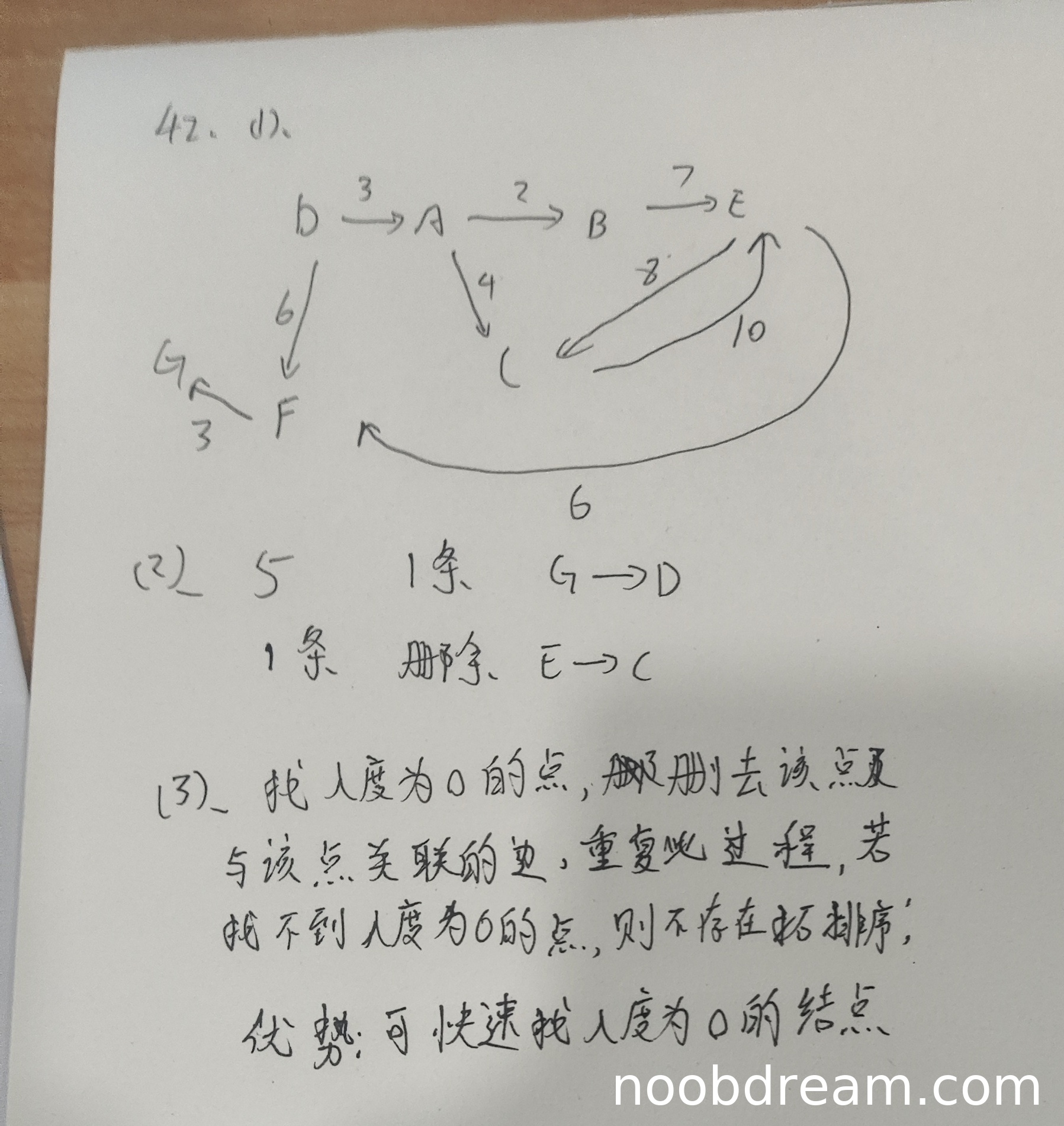 学生答案中未直接画出带权有向图,但根据两次识别结果,第二次识别结果中描述了部分边及权重(如D→A(3)、A→B(2)、B→E(7)、A→C(4)、E→C(8)、E→F(10)、D→F(6)、G→F(3)),但缺少标准答案中的关键边(如B→D(5)、C→E(10)、F→G(3)),且存在错误(如G→F(3)应为F→G(3),E→F(10)应为E→F(6))。由于未完整正确画出图,扣2分,得1分。