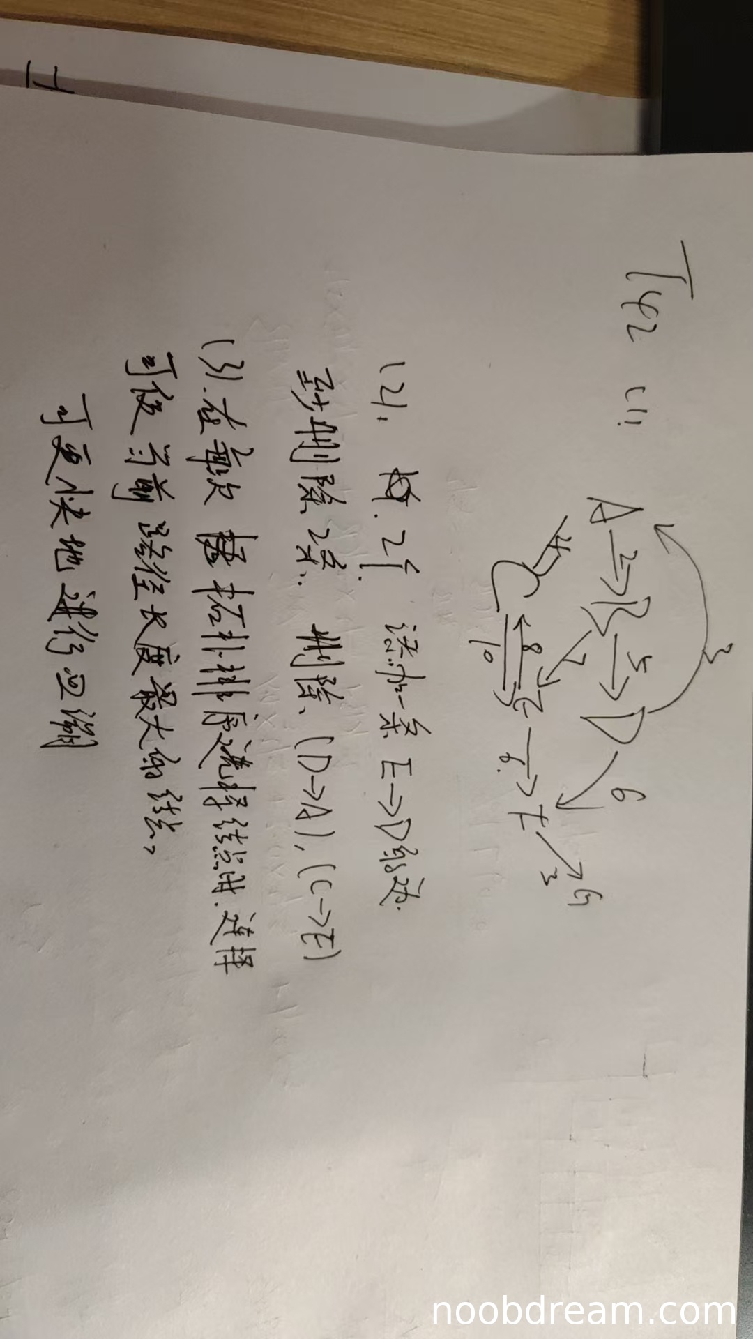学生回答中提及“添一条 E->D 的边”和“删除 (D->A), (c->E)”,但未说明强连通分量数量(标准答案为4个),且添加边的方案不完整(标准答案为添加1条边,但未说明具体效果);删除边的方案部分正确(删除D→A和C→E,但标准答案需删除两条边,且E→C也需删除)。识别结果存在混乱(如“有 E→D 的边,删除该边”与添加矛盾),逻辑不清晰。因此扣分:强连通分量数量未回答扣1分,添加方案不明确扣0.5分,删除方案部分正确但未完全匹配扣0.5分。得1分(满分3分)。