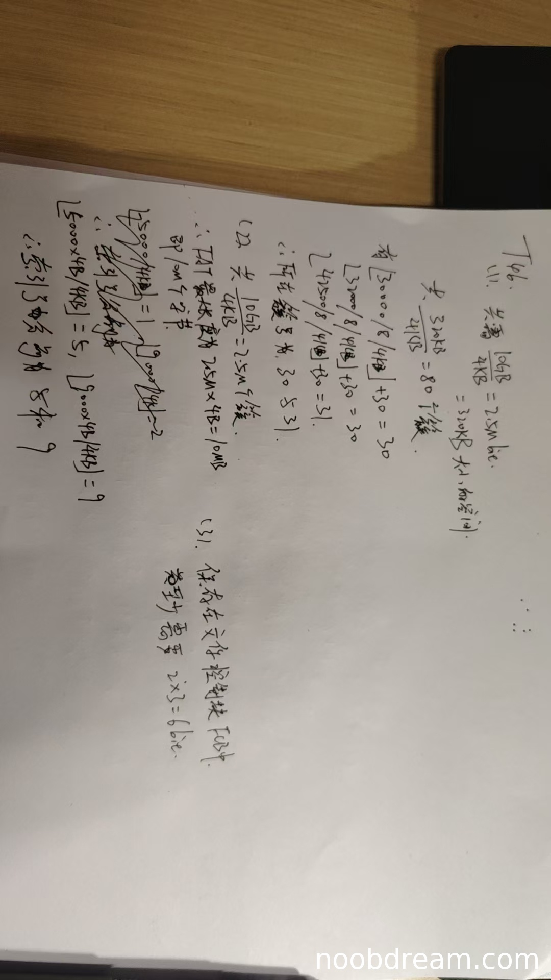 学生第一次识别结果中计算了位图管理所需簇数,但未直接回答问题,且计算过程有误(如“共需 $\frac{16B}{4KB}=25Mbc$”无意义)。第二次识别结果未涉及位图状态位簇号计算。学生未正确计算文件A的簇(30000、32000、42500)在位图中的状态位所在簇号,且未给出明确答案(如标准答案的30、30、31)。但学生提到“30”和“31”,部分接近标准答案,但逻辑不完整且计算错误(如$\frac{40250}{8/4KB}$错误)。因此扣2分,得1分(理由:部分数值正确但整体逻辑错误)。