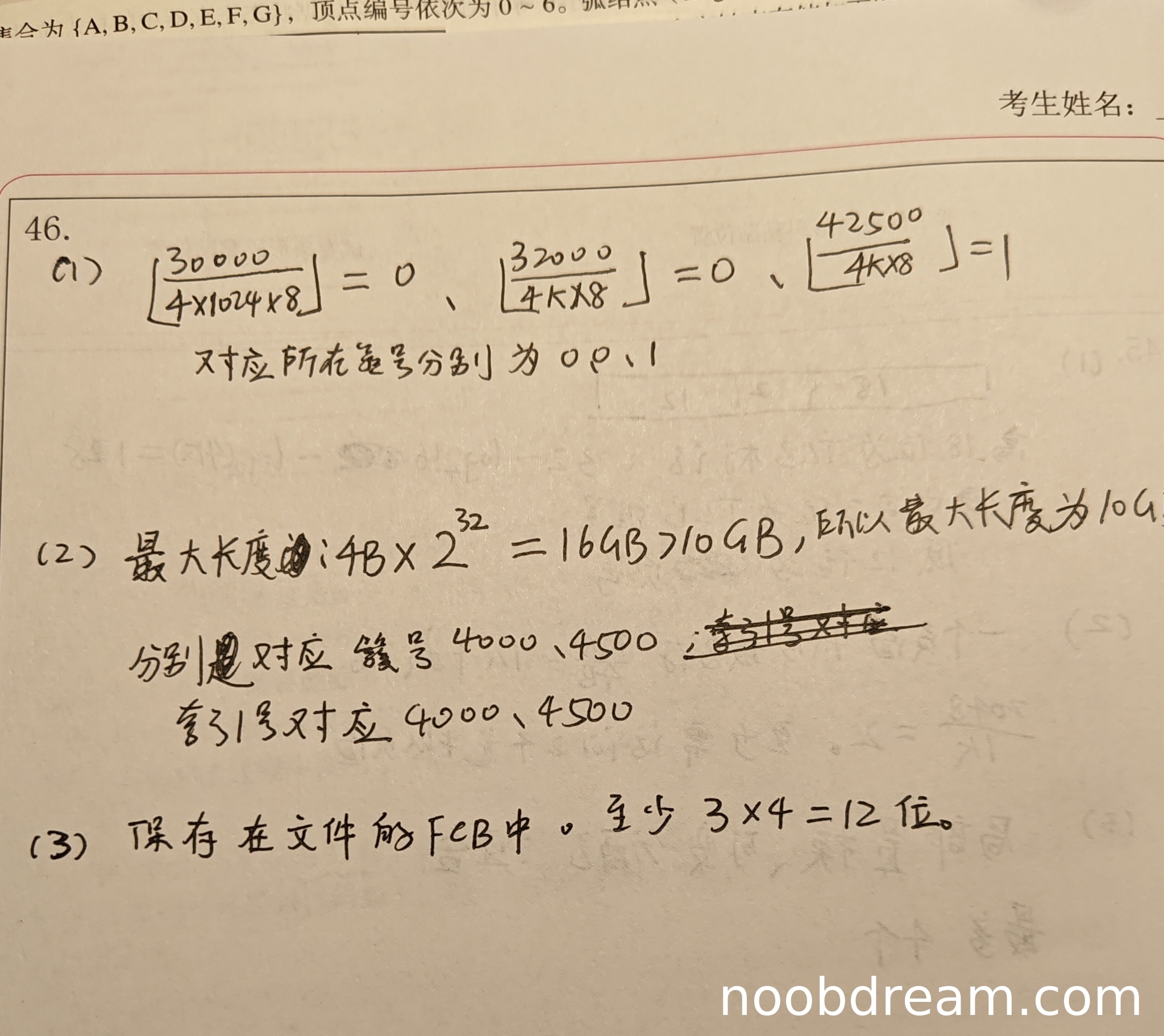学生计算FAT最大长度时错误(应为10MB,但学生写为10G),逻辑错误扣1分。对于第5000和9000字节的簇号判断正确(4000和4500),但FAT表项索引号部分,学生未明确写出索引号(应为5000和4000),仅提到“对应簇号4000、4500”,且后续语句混乱(“管31号对应4000、4500”可能为识别错误)。思路部分正确,但关键答案缺失且长度计算错误,扣2分。得1分。