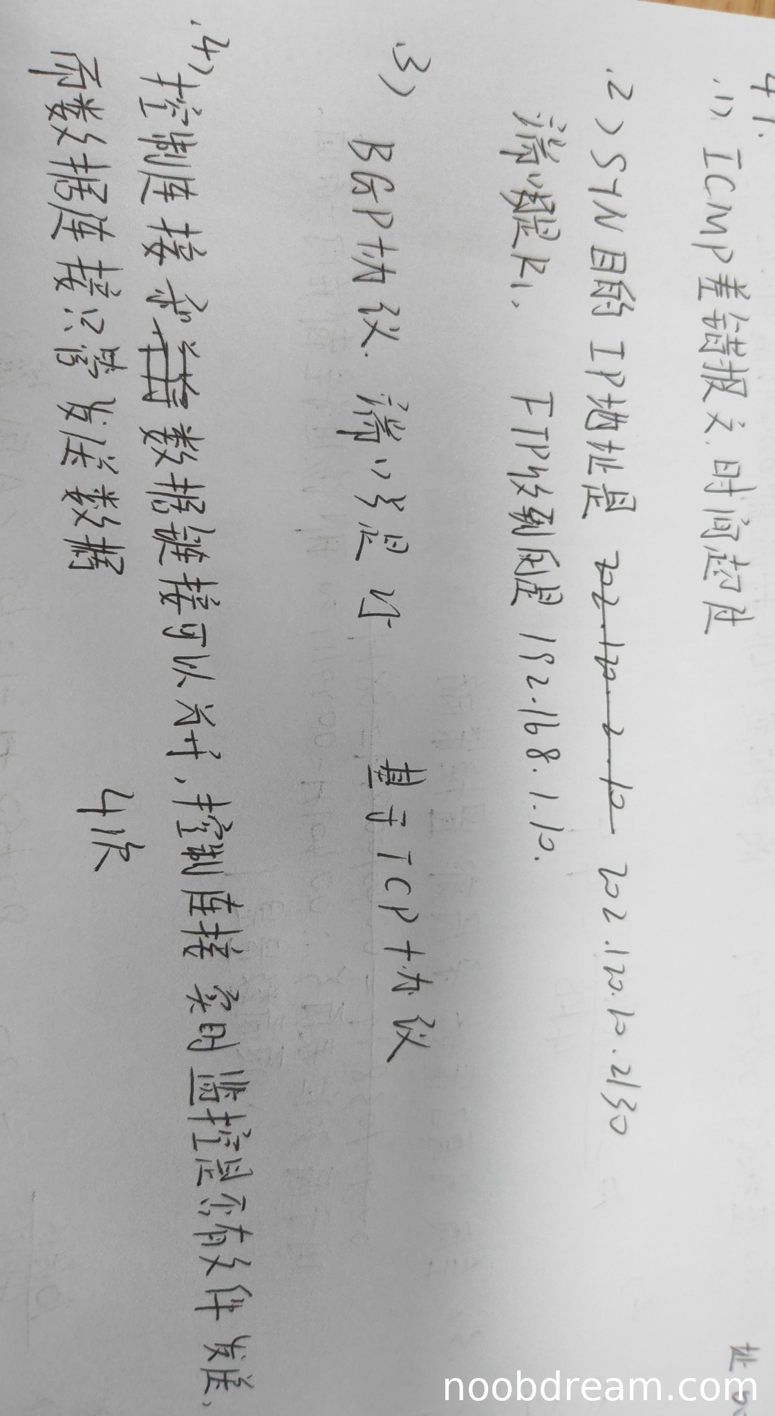 学生第一次识别回答“控制连接和数据链接可以分开,控制连接实时监控是否有文件发送,而数据链接按只管发送数据 4层”,第二次识别回答“控制连接和数据连接可以并行,控制连接实时监控是否有文件发送,而数据库接口管理医疗数据”。问题第一部分问主要好处,标准答案为“使协议更加简单和更容易实现,或传输时利用控制连接进行控制”。学生答案“可以分开”和“并行”表达了类似意思,但“实时监控”部分正确;第二部分问最少连接次数,标准答案为4次(1控制+3数据)。学生第一次识别中“4层”可能是“4次”的误写(识别错误),根据禁止扣分规则不扣分,且正确回答了次数...