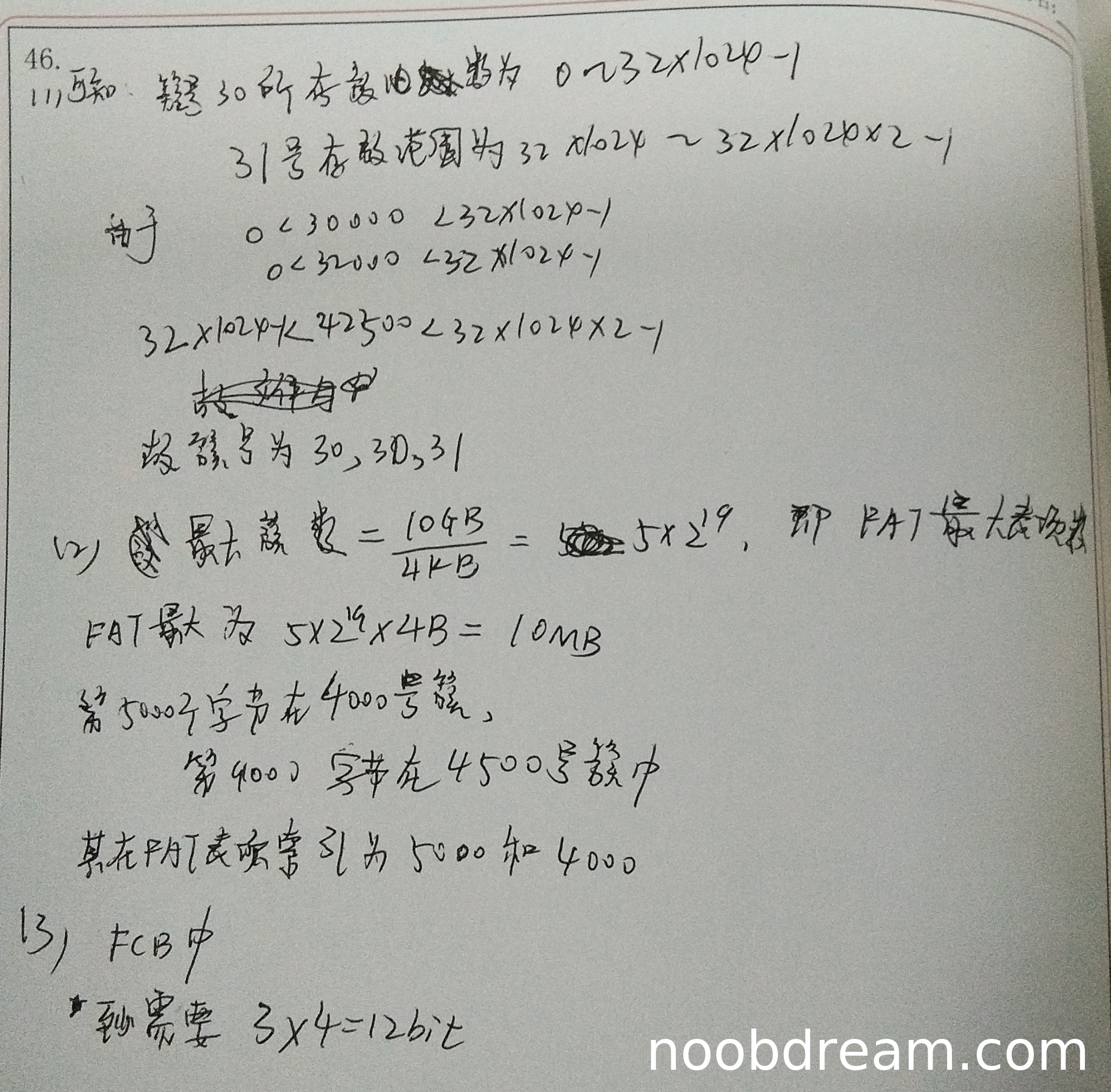 学生正确计算了FAT最大长度为10MB(尽管第一次识别中写为“104B”可能是“10GB”的识别错误,但第二次识别正确为10GB,且计算正确)。对于文件B的第5000字节和第9000字节所在簇号(4000和4500)及其FAT表项索引(5000和4000)的判断正确。得3分。