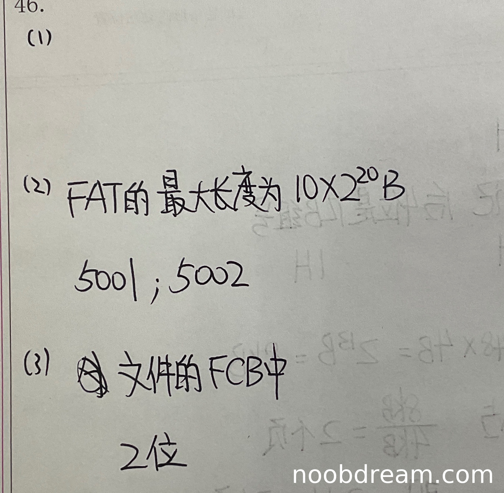 文件B的第5000字节和第9000字节的FAT表项索引号:学生回答“5001;5002”,但标准答案为第5000字节对应表项索引号5000(因为簇4000的FAT表项索引号为4000,但问题问的是字节所在簇的FAT表项索引号,即簇号对应的FAT表项索引号等于簇号本身)。学生计算错误,逻辑错误扣1分(但识别结果中“5001;5002”可能是误写,但无法判断为误写,因此按错误处理)。此外,学生未回答第9000字节对应的表项索引号(应为4000),但问题要求两个索引号,学生只给出了两个错误值,因此再扣1分。本部分得0分(FAT长度计算1分,索引号部分0分)。