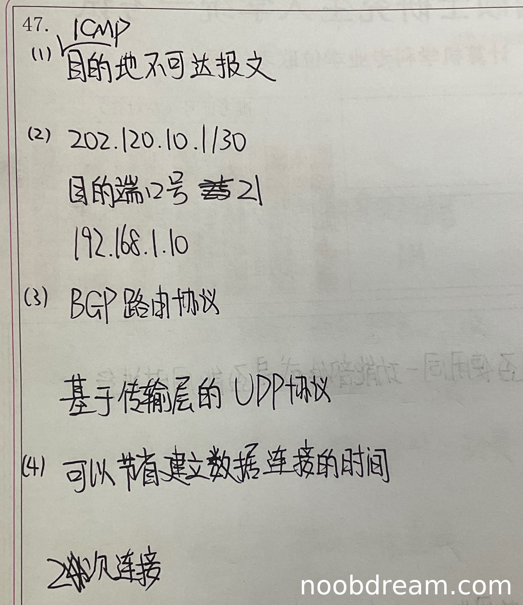 学生两次识别均回答协议为“BGP”(正确,1分),但均回答基于“UDP协议”(错误)。BGP基于TCP协议,端口179。逻辑错误,扣2分(协议和端口各1分)。得1分。