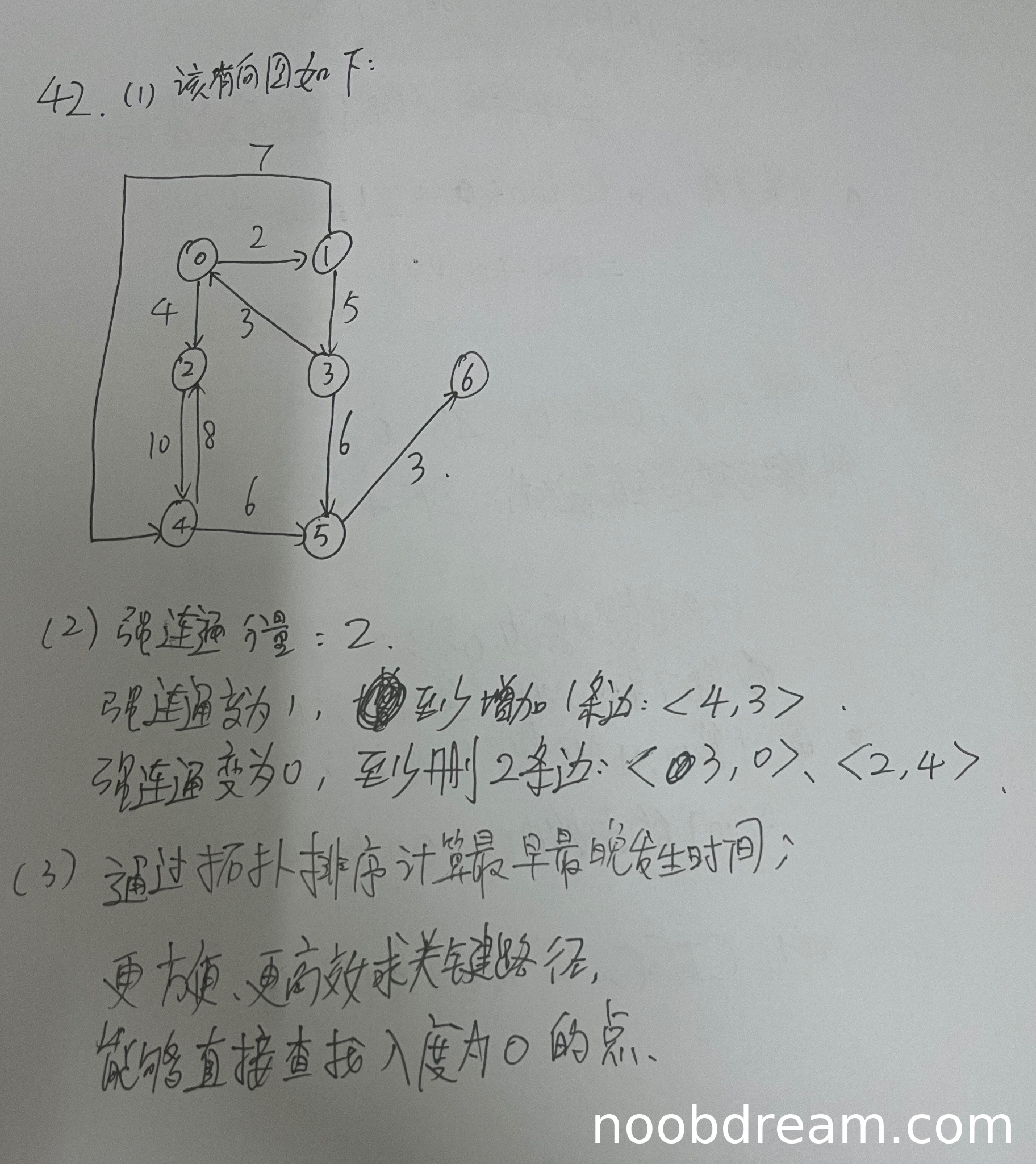 学生回答强连通分量数量为2(错误,应为4),扣1分;添加边方案为<4,3>(即E→D),但标准答案要求添加边使强连通分量数量变为1,此方案可能有效(例如G→D或E→D等),但未指定具体顶点名称(用编号表示),且未说明效果,可视为部分正确,扣0.5分;删除边方案为<3,0>(D→A)和<2,4>(C→E),这两条边删除后确实可破坏强连通分量({A,B,D}和{C,E}),使数量大于1的强连通分量变为0,方案正确,得1分。本小题总得分:1.5分(强连通分量数量错误扣1分,添加边部分正确扣0.5分,删除边正确得1分)。
