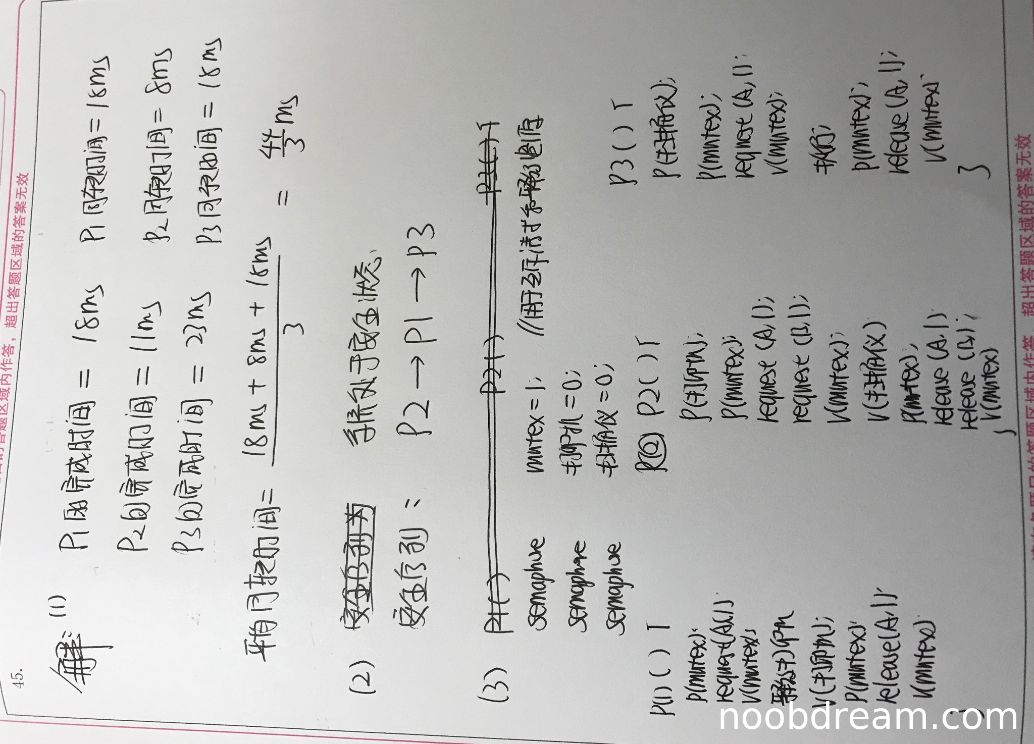 - 信号量定义缺失(未定义S1和S2),且使用了未定义的信号量(如mmtex、flntx、request等),这不符合同步需求(P1完成后P2才能用扫描仪,P2完成后P3才能执行)。