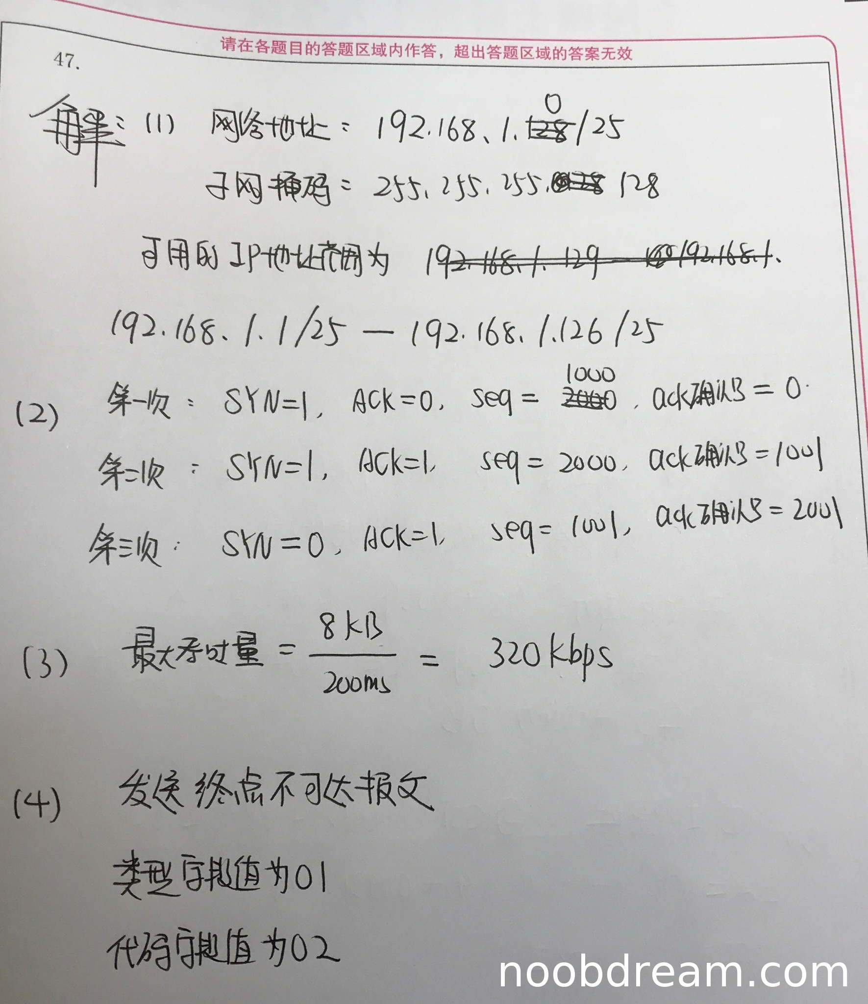 学生两次识别结果均错误:第一次识别结果为192.168.1.128/25(子网掩码255.255.255.128),第二次识别结果为192.168.1.0/25(子网掩码255.255.255.128)。标准答案为子网掩码255.255.255.192(/26),网络地址192.168.1.0。学生答案的子网掩码(/25)会导致每个子网支持126台主机,但题目要求划分4个均等子网且每个子网至少支持20台主机,/25掩码仅能划分2个子网(128和0),不符合要求。可用IP范围计算也错误。扣3分。