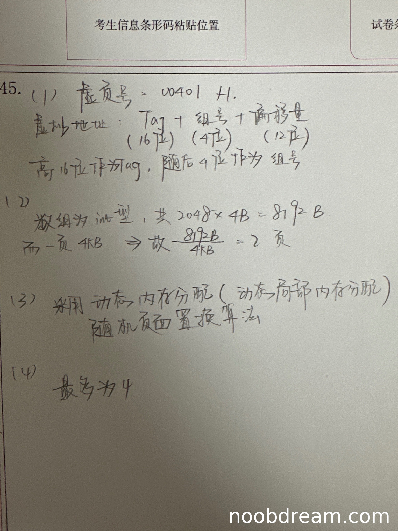 学生第一次识别结果中虚页号给出"00401 + 1"不完整,但第二次识别结果正确给出虚页号为"00401 H"(1分)。对于TLB标记和组号的划分,两次识别都正确指出高16位作为标记,随后4位作为组号(1分)。因此本小题得2分。
