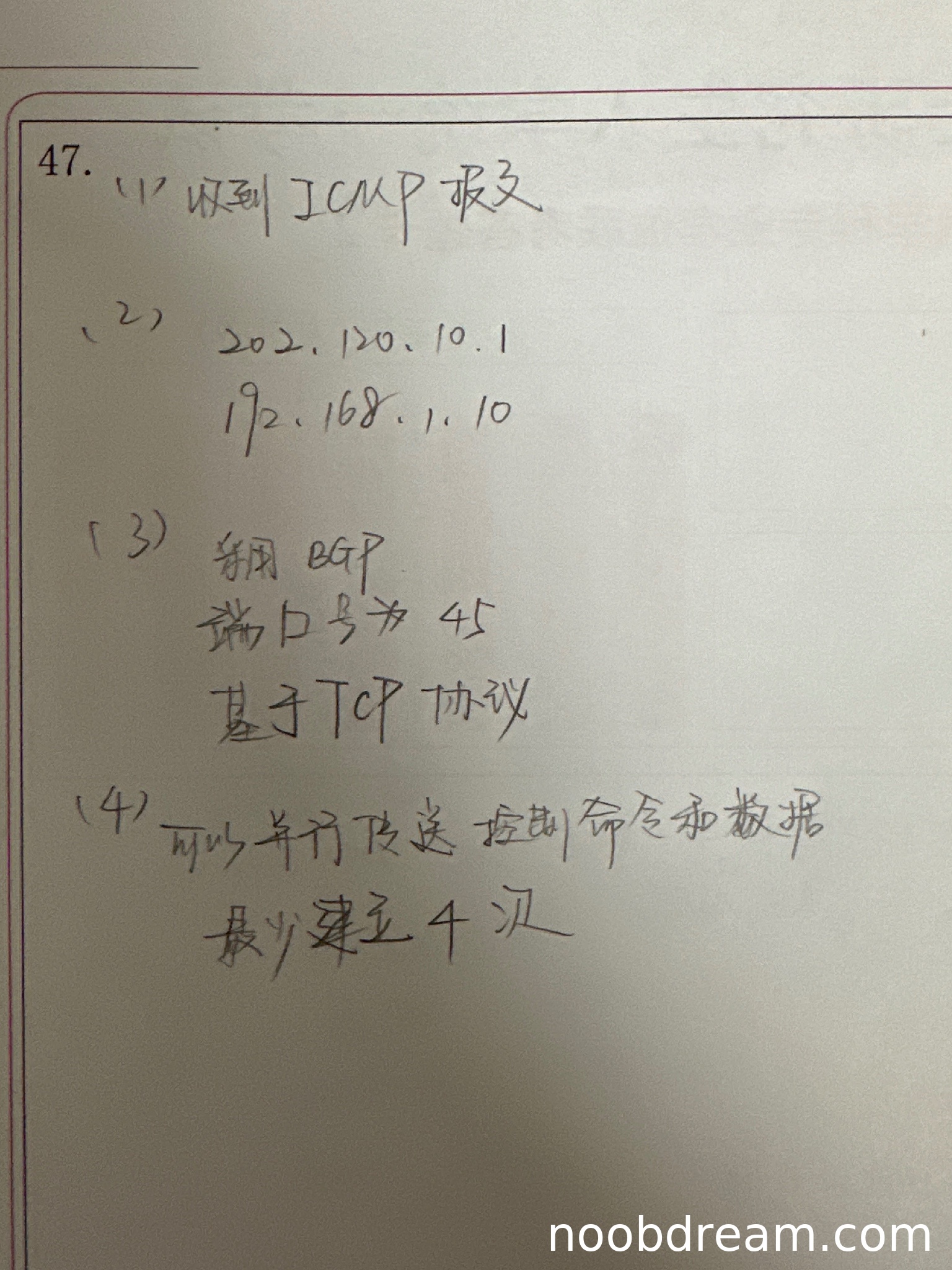 学生回答协议为“BGP”和基于“TCP协议”正确,各得1分。但端口号回答“45”错误(应为179),扣1分。总计得2分。