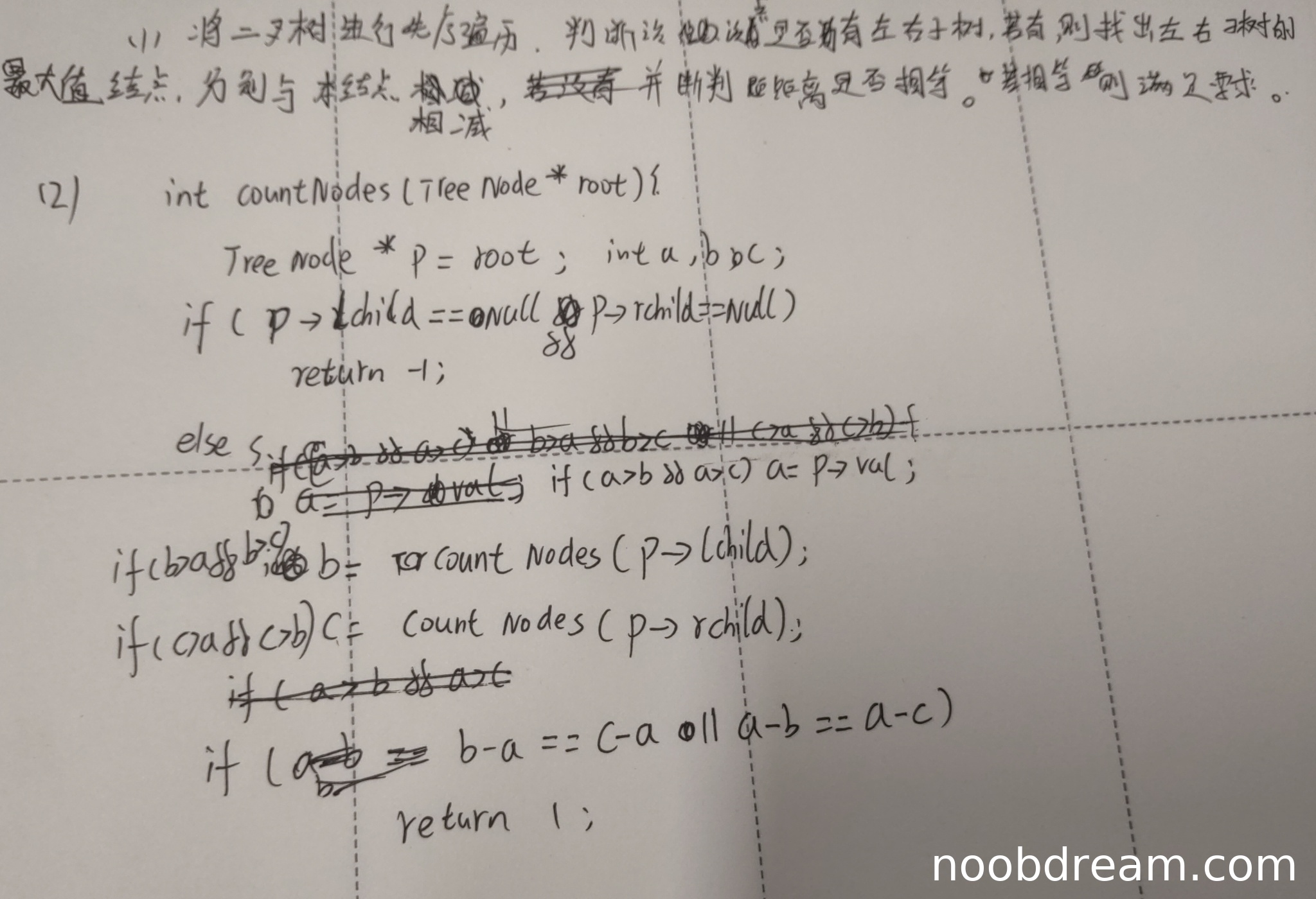 学生答案描述:“将二叉树进行先序遍历,判断该结点是否有左右子树,若有,则找出左右子树的最大值结点,分别与本结点构成,若没有并判断距离是否相等。若相等则满足要求。” 这里提到了先序遍历和判断左右子树存在性,但“找出左右子树的最大值结点”不准确(应为左子树最大值和右子树最小值),且“分别与本结点构成”表述模糊(应计算差值)。基本思路部分正确,但关键细节有误。得1分。