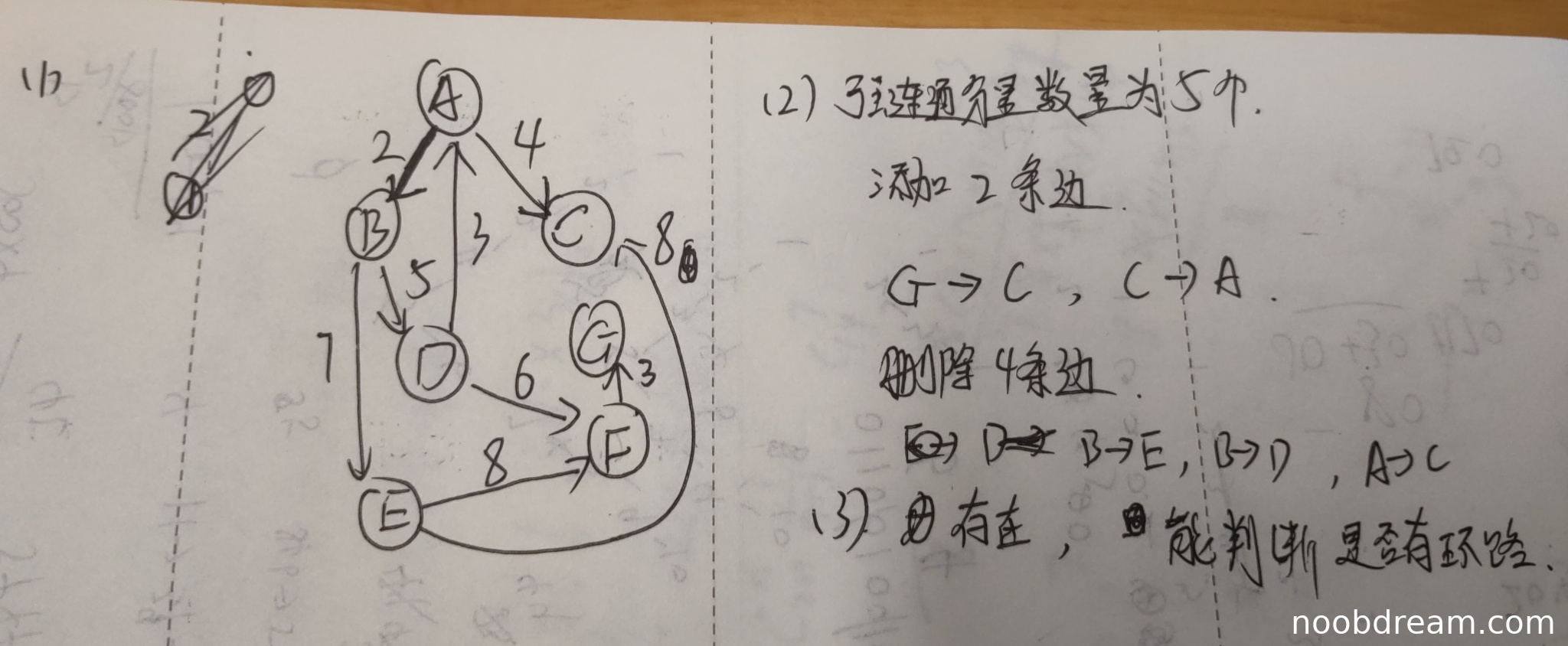 学生回答强连通分量数量为5个,但标准答案为4个({A,B,D}、{C,E}、{F}、{G}),因此数量判断错误,扣1分。添加边部分:学生提出添加2条边(G→C和C→A),但标准答案指出至少添加1条边(如G→D)即可使强连通分量数量变为1,学生方案效率不足且未达到最少边数要求,扣1分。删除边部分:学生提出删除4条边(B→E、B→D、A→C),但标准答案指出删除2条边(如D→A和E→C)即可使顶点数量大于1的强连通分量数量变为0,学生方案未满足最少删除要求且逻辑错误(删除B→D和A→C可能破坏图结构但未针对强连通分量核心边),扣1分。本问总得0分。