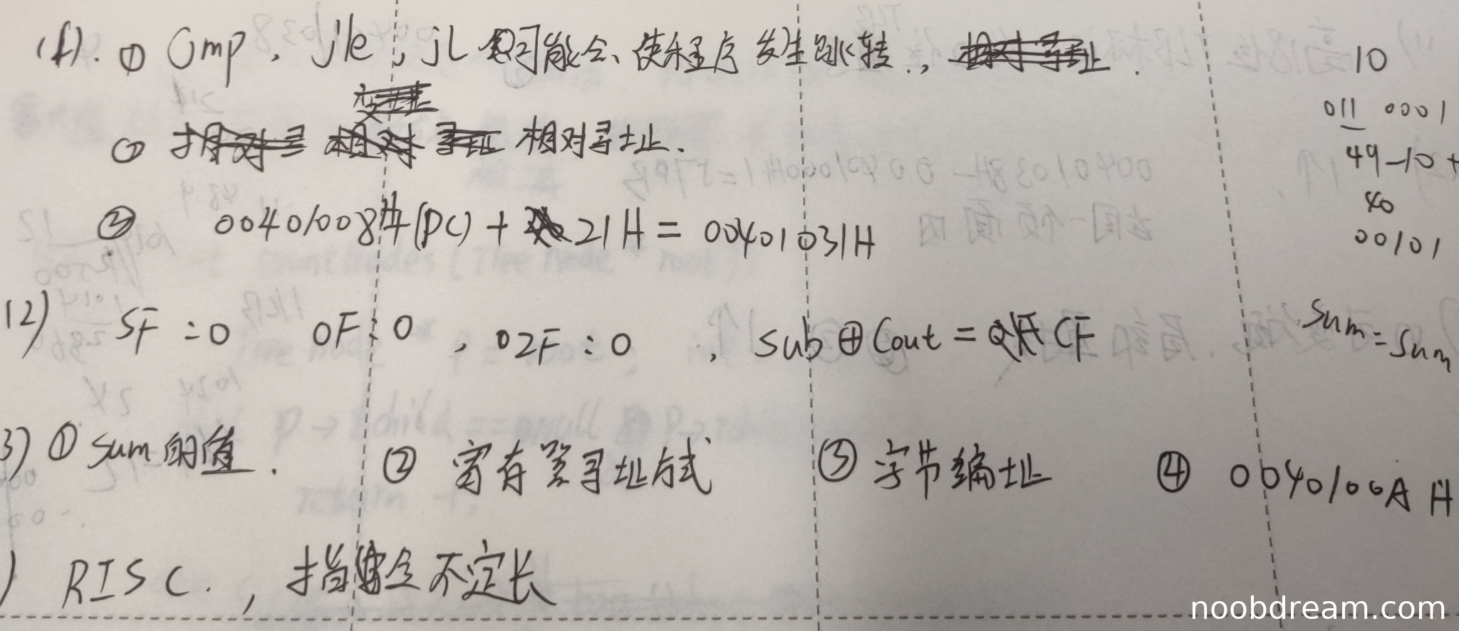 学生两次识别均正确给出SF=0、OF=0、ZF=0(1分)。但逻辑表达式错误(第一次为"sub ⊕ Cout = QF CF",第二次为"Sub⊕Cout = CF"),未正确表达jle条件(应为(SF⊕OF)|ZF),扣2分。得1分。