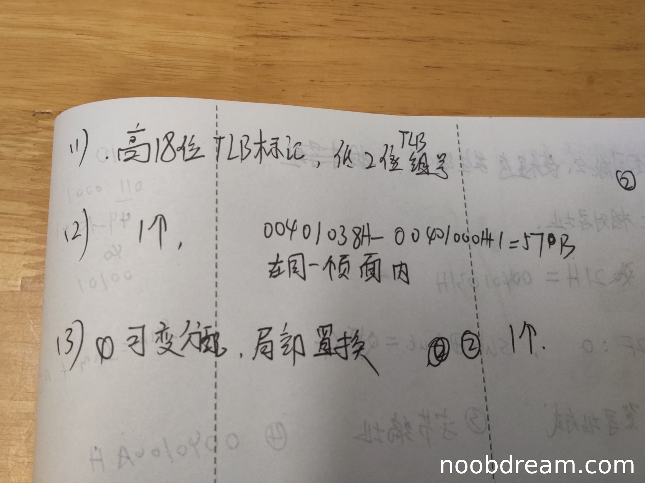 学生答案中给出TLB标记为高18位,组号为低2位,但标准答案为标记高16位,组号低4位。学生未正确计算组号位数(TLB共16组,需log2(16)=4位组号),且虚页号总位数为20位(页大小4KB,偏移12位,虚页号20位),因此标记应为20-4=16位。学生答案存在逻辑错误,但正确指出了标记高位、组号低位的基本划分方式。扣1分,得1分。
