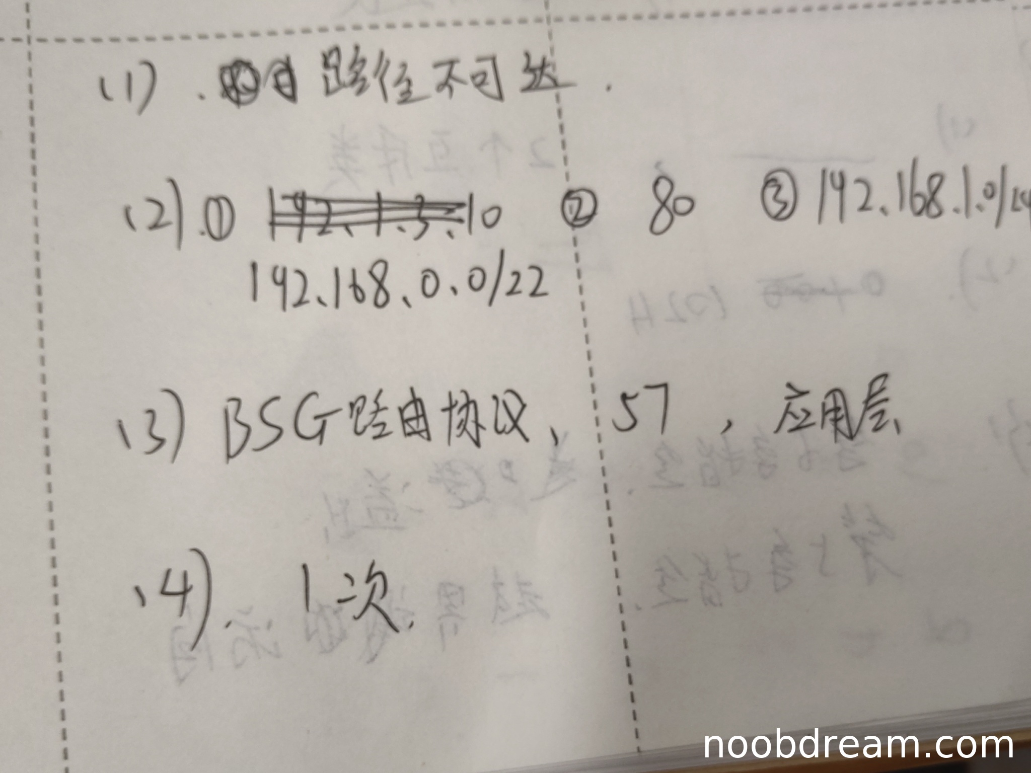 学生两次识别均回答“BSG路由协议”(可能为BGP误写),但协议名称错误(BGP正确);端口57(错误,应为179);基于“应用层”(错误,BGP基于TCP传输,属于传输层协议)。协议名称误写(BSG→BGP)不扣分,但端口和基础协议错误,逻辑错误扣2分(端口和协议各1分)。