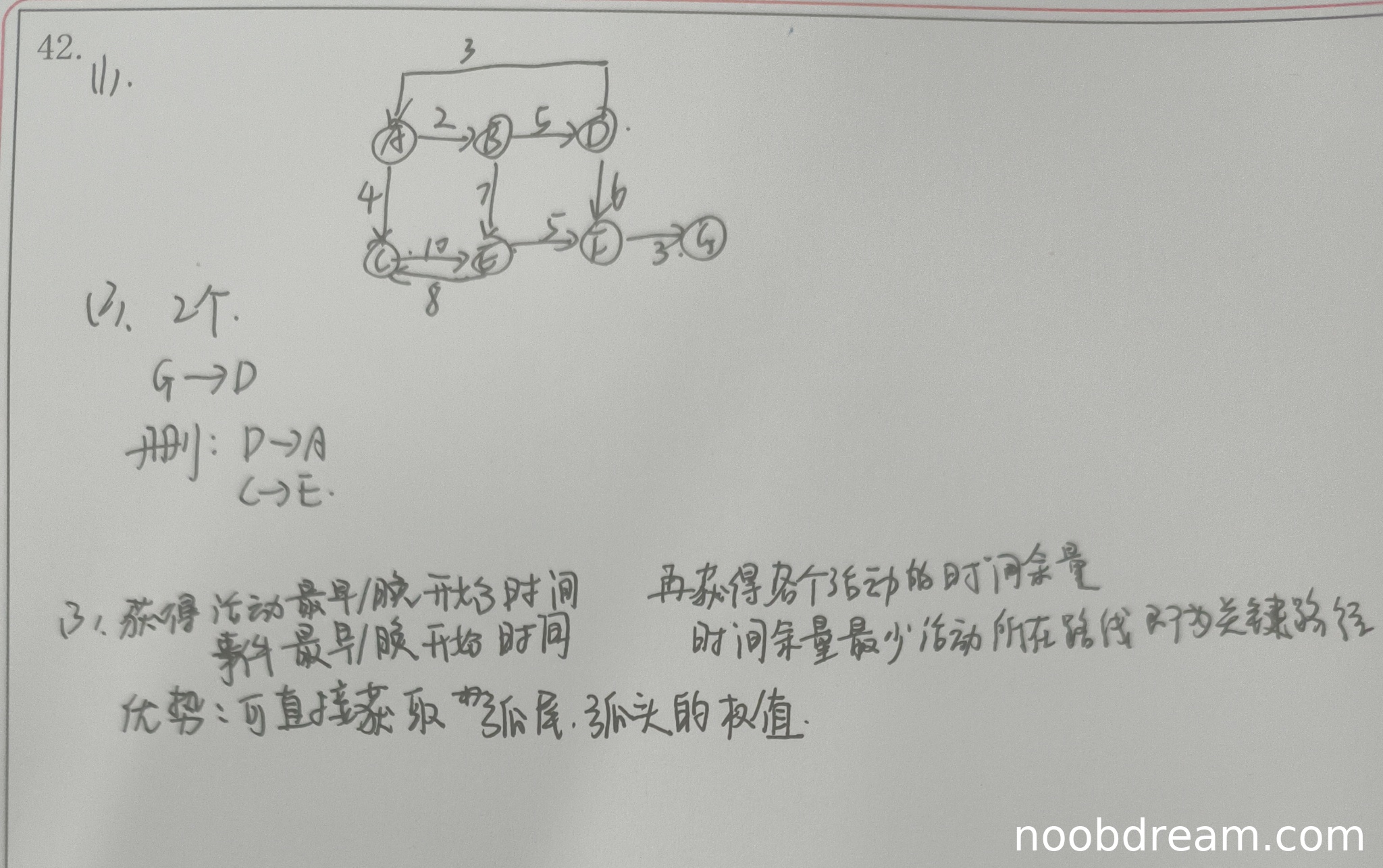 学生简述了求关键路径的思路(通过活动最早/晚时间计算时间余量),但未提及拓扑排序判断有向无环图(DAG)和AOE网验证(如唯一源点、汇点),思路不完整;优势描述(可直接获取弧尾、弧头权值)不准确,标准答案优势是十字链表可直接访问入边,简化逆拓扑计算。思路部分正确但缺失关键点扣1.5分;优势描述错误扣1分。因此,本题得0.5分(3-1.5-1=0.5)。